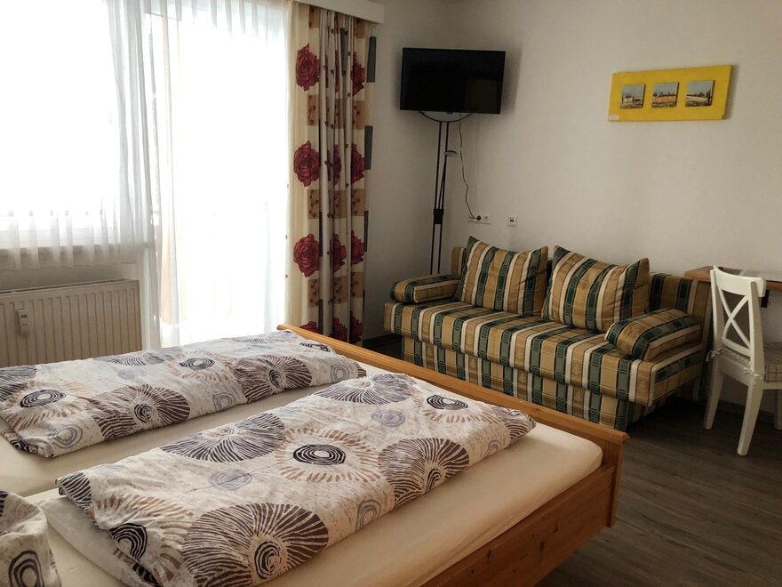 The apartment "Käfer" offers 56 m² of space for 2 to 4 people. The flat has a bedroom with double bed and a kitchen-living room with pull-out couch (for 2 persons), fully equipped kitchenette (incl. crockery, electric cooker, oven, dishwasher, coffee machine, etc.), a seating area and satellite TV as well as a storage room. The separate bathroom is equipped with a shower and WC. Free W-LAN is available throughout the flat. There is also a washing machine in the flat. A table can be reserved for your stay on the Kollerhof terrace.