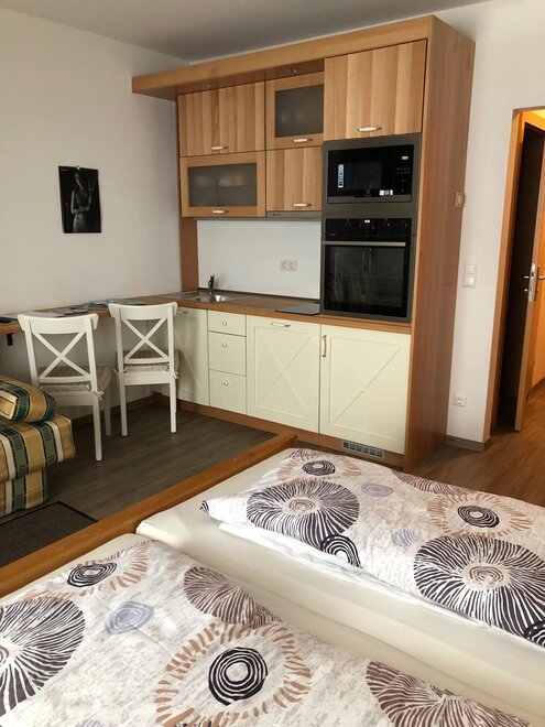 The 29 m² apartment "Leiterwagerl" offers space for 1 to 2 people. The flat has a living/sleeping area with double bed, fully equipped kitchenette (incl. crockery, electric cooker, oven, coffee machine, etc.), a seating area and satellite TV as well as a storage room. The separate bathroom is equipped with shower/WC. Free W-LAN is available in the apartment. The two app. Leiterwagen and Alm are right next to each other and can therefore be wonderfully combined, e.g. for families with older children, couples of friends or 4 friends who like to travel together. A table can be reserved for your stay on the Kollerhof terrace.