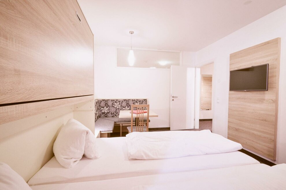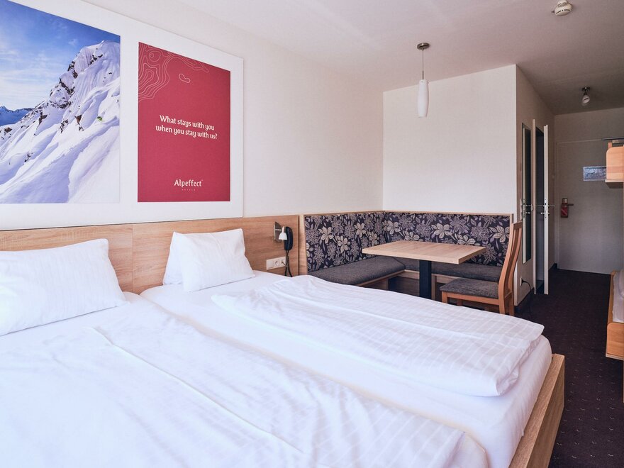 Equipped with a double bed, two fold-out extra beds and a seating area. It is also possible to book a double room with a connecting door to a further double room, so the room will fit 4-8 people. Please contact us here for connected double rooms.Location/room with view/apartment