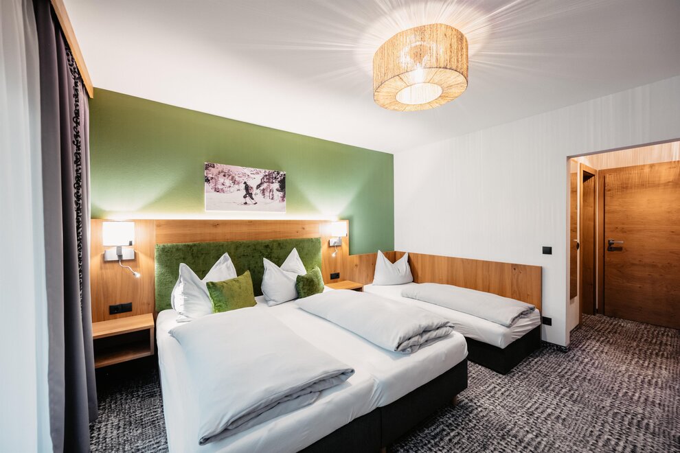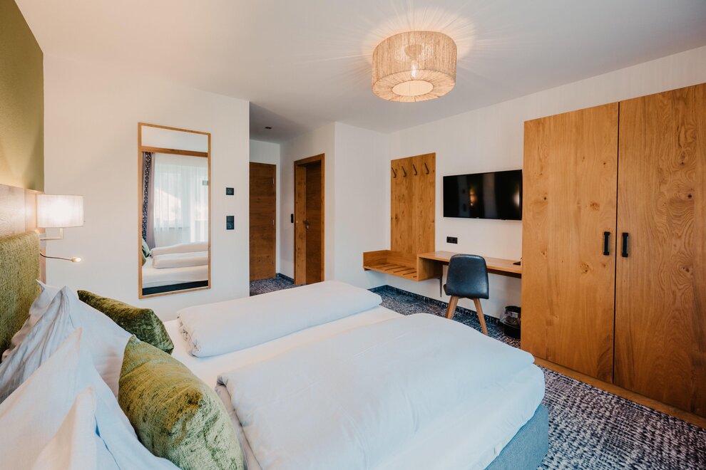 Our rooms are bright, functional, and equipped with everything you need: shower/WC, flat-screen TV, free Wi-Fi, safe, and balcony with views of the snowy mountains or tranquil nature.