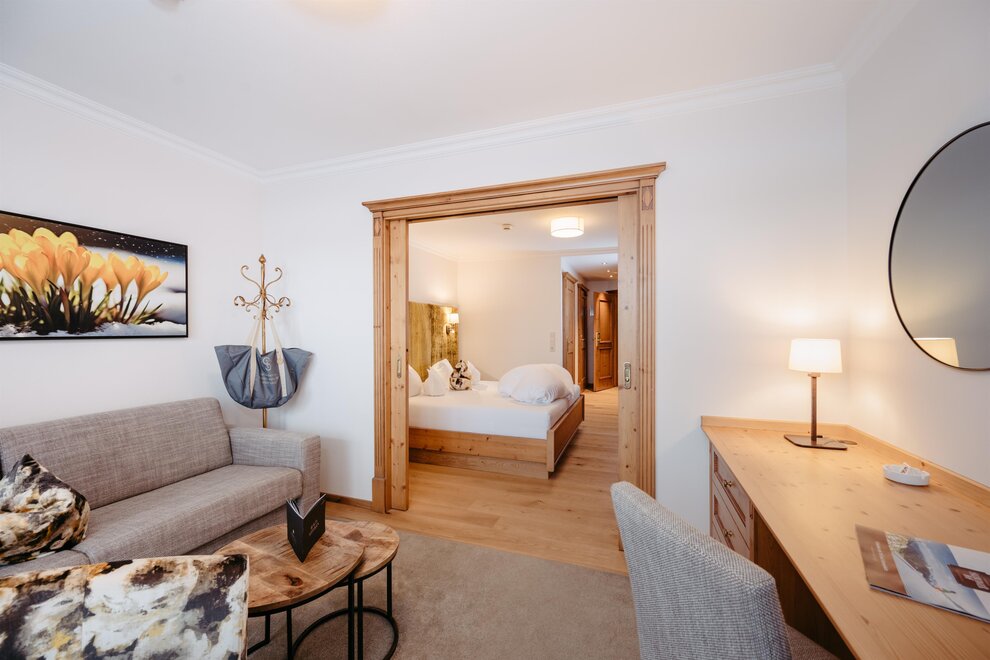 Open-plan suite with views of our glorious mountain panoramas, bed- and living areas, seating group with tiled stove, tastefully and luxuriously appointed, big bathroom with double washbasins, bathtub, shower, separate WC
