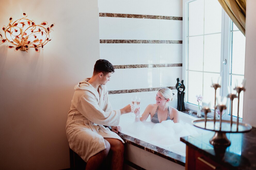NEW spacious and comfortable junior suite with balcony. Living room with tiled stove and cosy sitting corner. Separate bedroom, tastefully and luxuriously furnished, large bathroom with twin hand basins, cosmetic mirror, hair dryer, separate WC, bath, many with separate shower