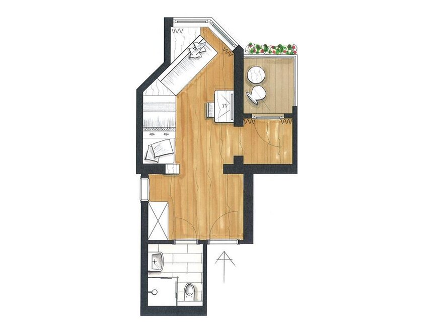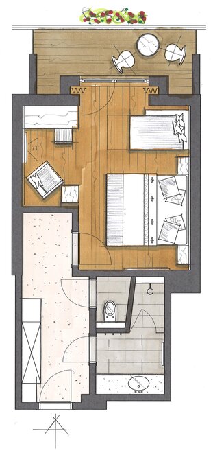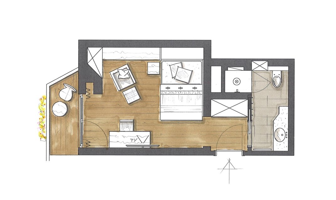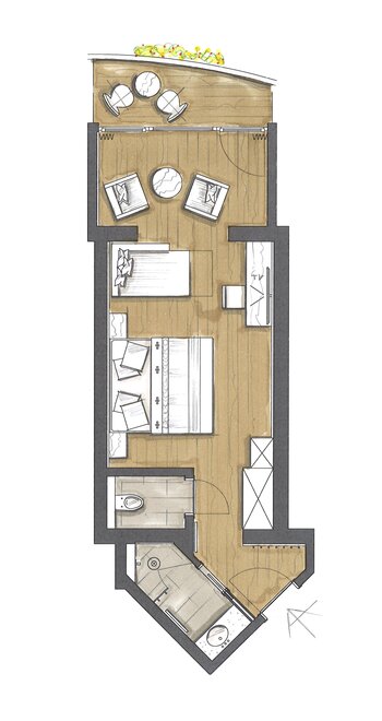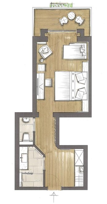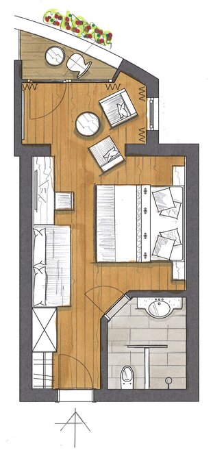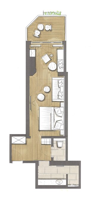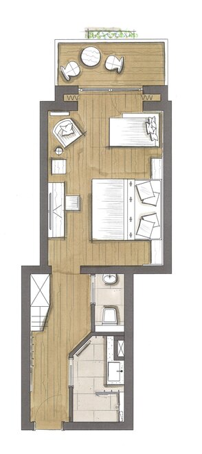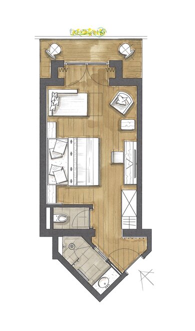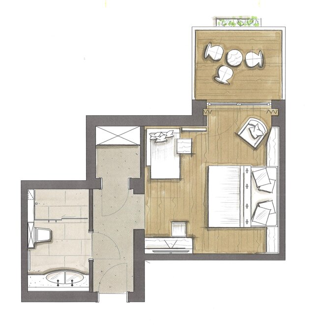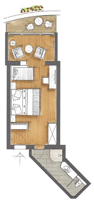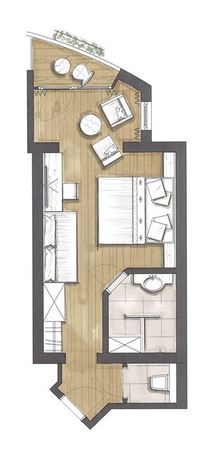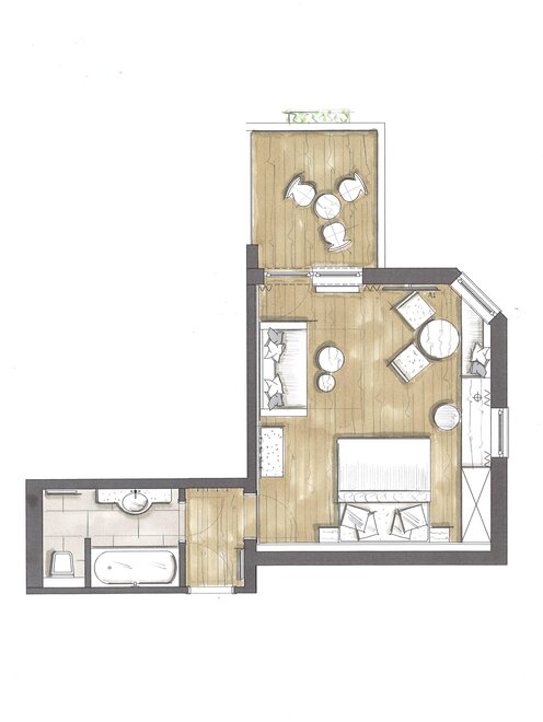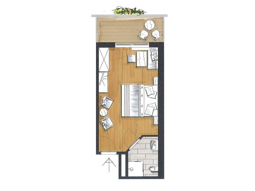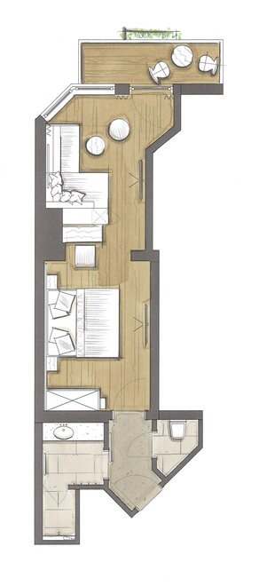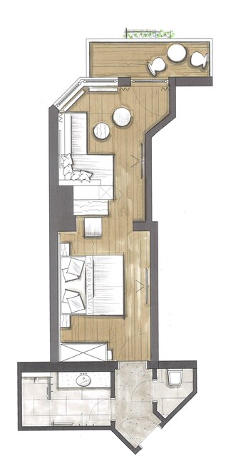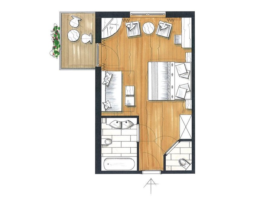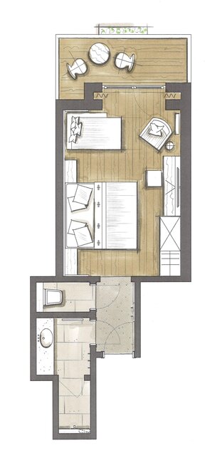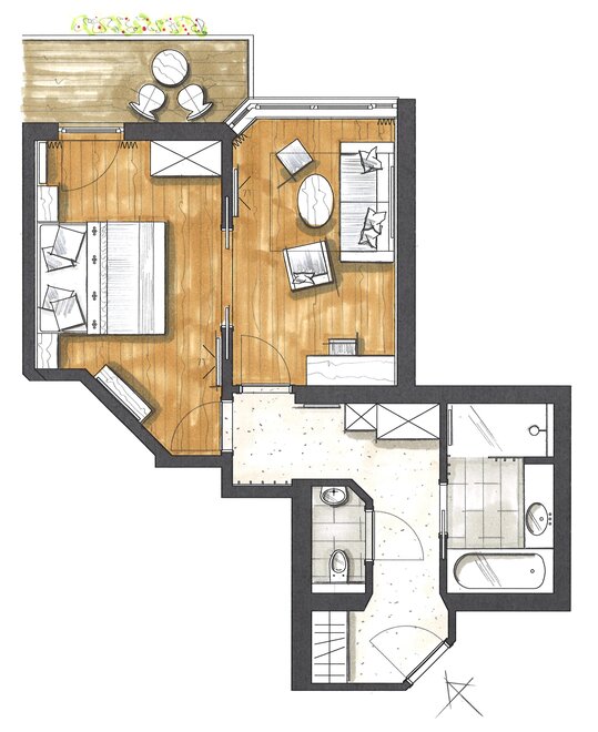 Suite with a furniture in pine wood, shower and /or bath tube, toilett, balcony Flat-TV and a safe, free-wifi. Abaout 38-39 m²