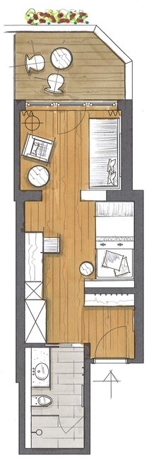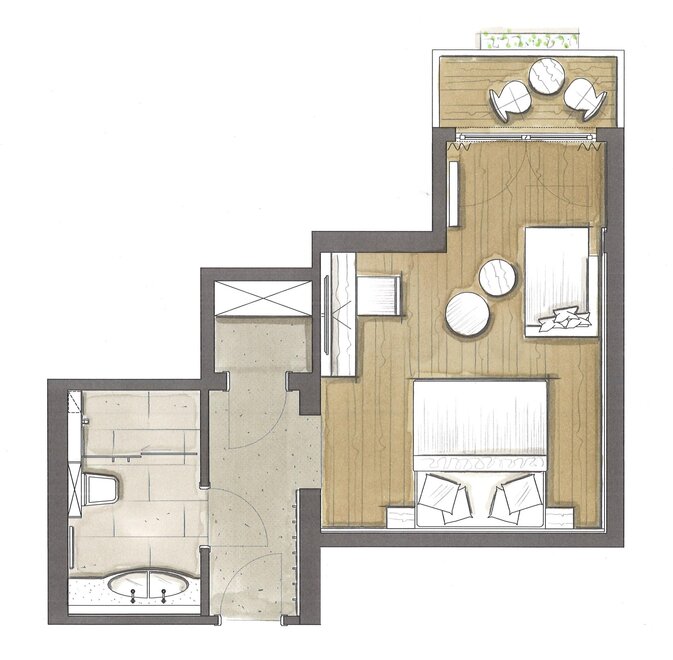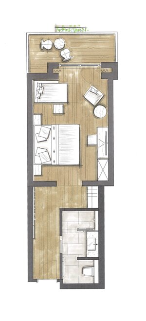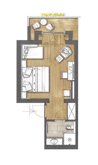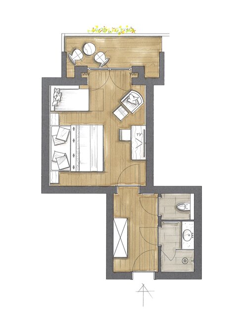 Family room Typ "Rohrmoos" for 2 adults and 2 children (2 seperate bedrooms and 1 bathroom) with balcony, TV, safe and telephone. Approx. 45m²