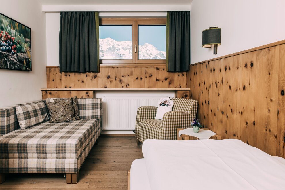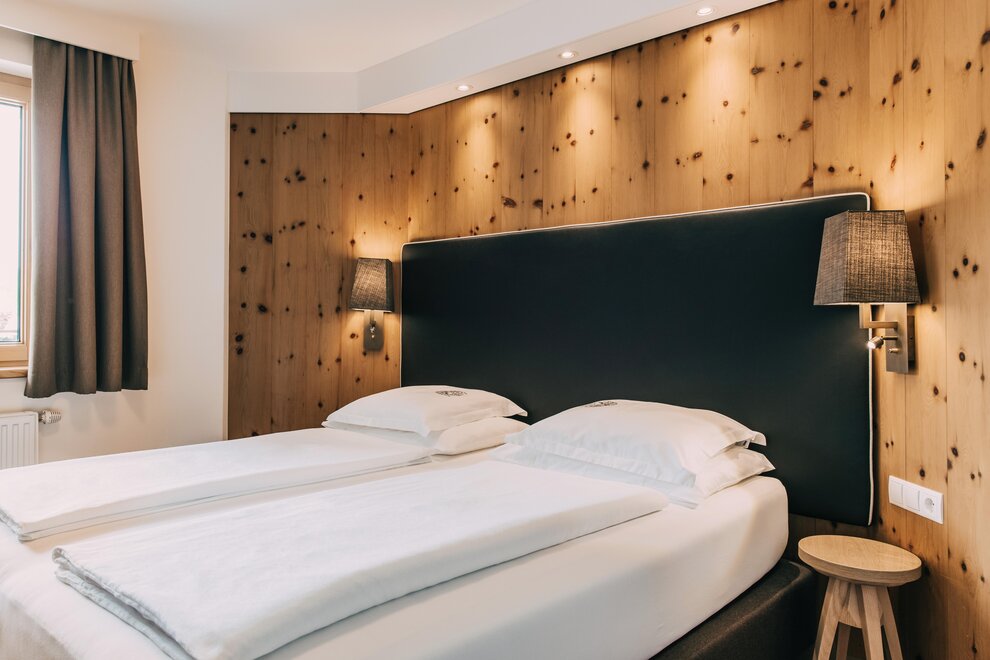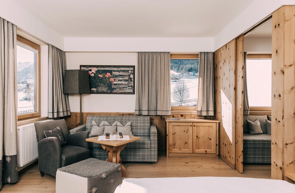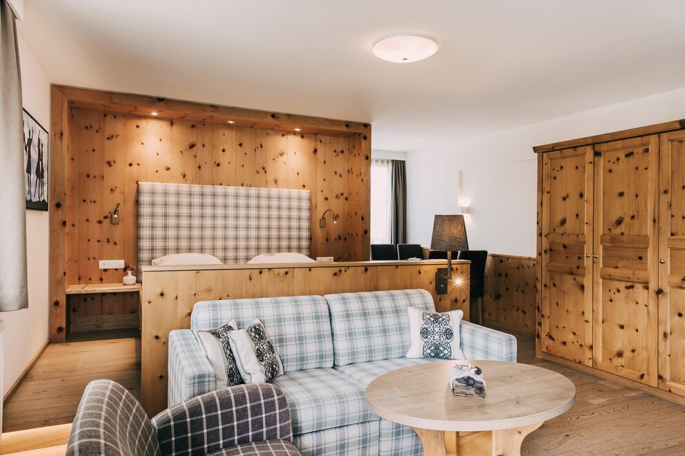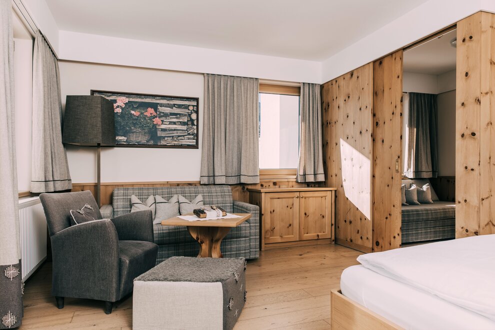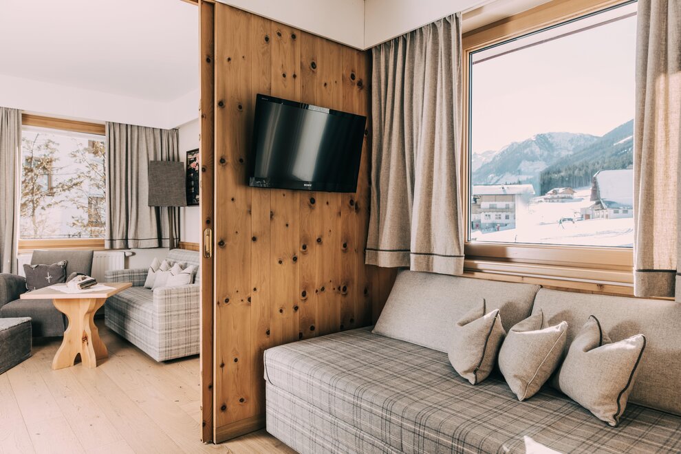 Family room Zirbe, about 52m². In a beautiful, sleep-promoting pinewood furnishing. Two seperate bedrooms, one bathroom with shower and bath tube or two seperate bathrooms with showers. Balkony, safe, free-wifi, 2 flat-screen TVs.