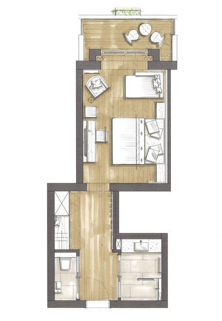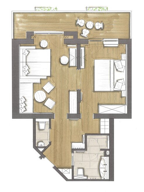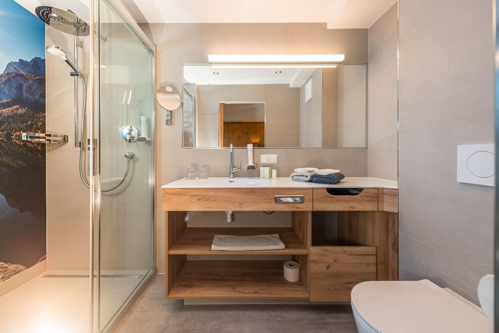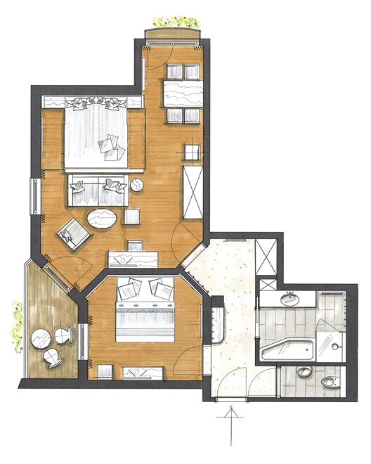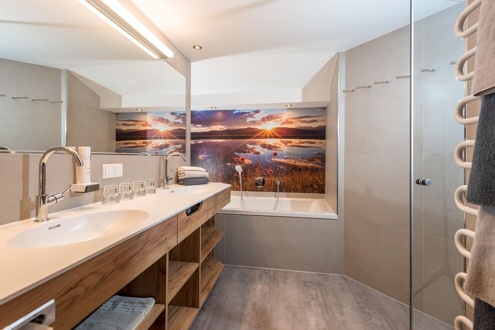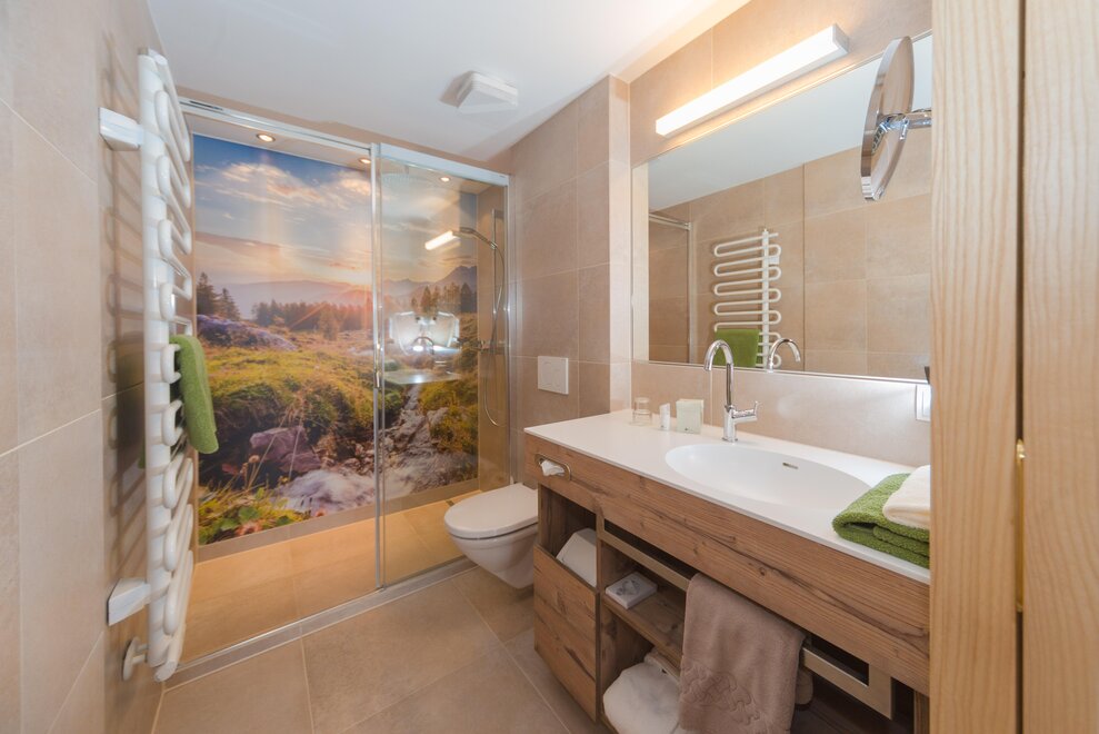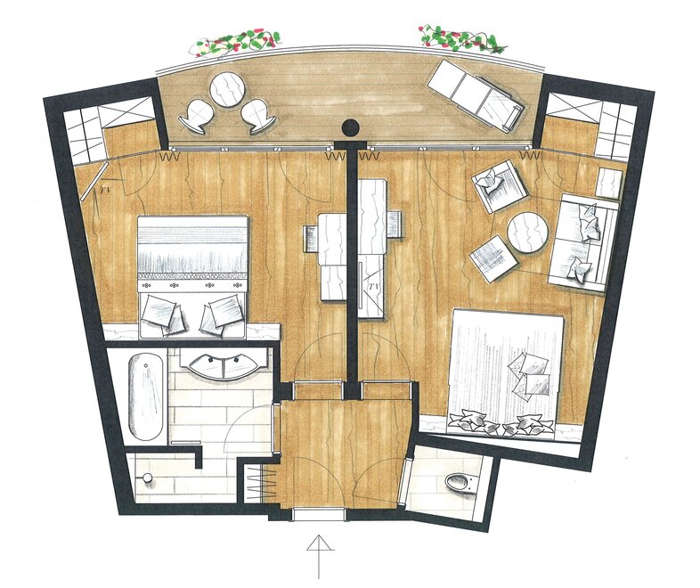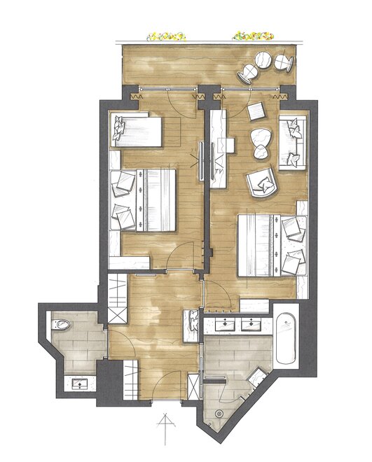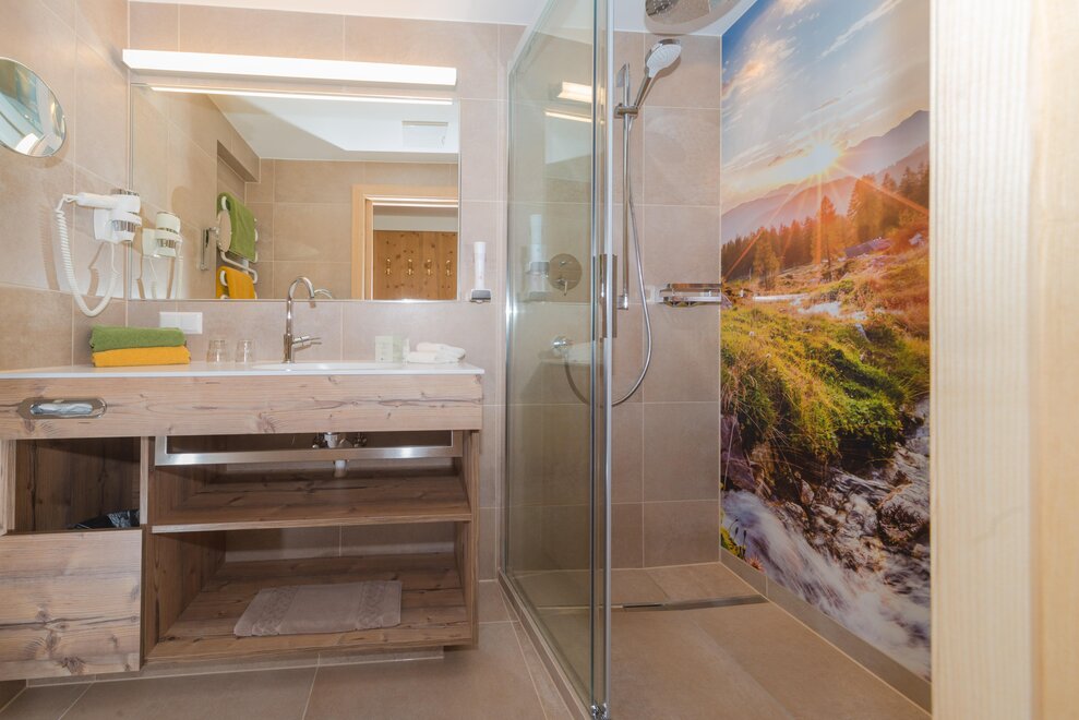 Family room Zirbe, about 52m². In a beautiful, sleep-promoting pinewood furnishing. Two seperate bedrooms, one bathroom with shower and bath tube or two seperate bathrooms with showers. Balkony, safe, free-wifi, 2 flat-screen TVs.