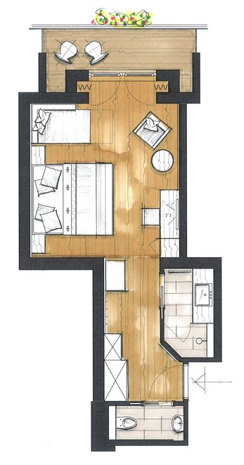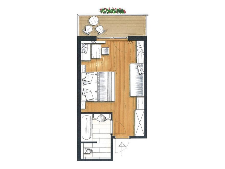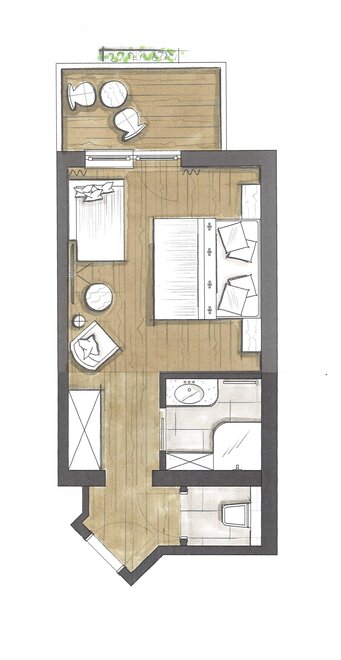 Single room with shower or bath tube, WC, balcony, Flat-TV, safe and telephone. About 18-20m²