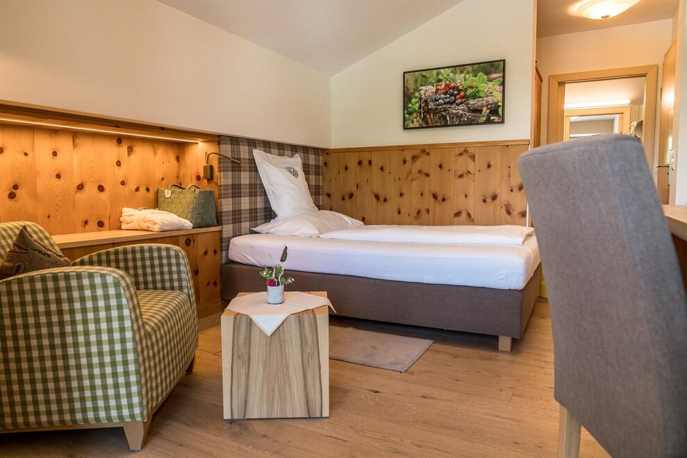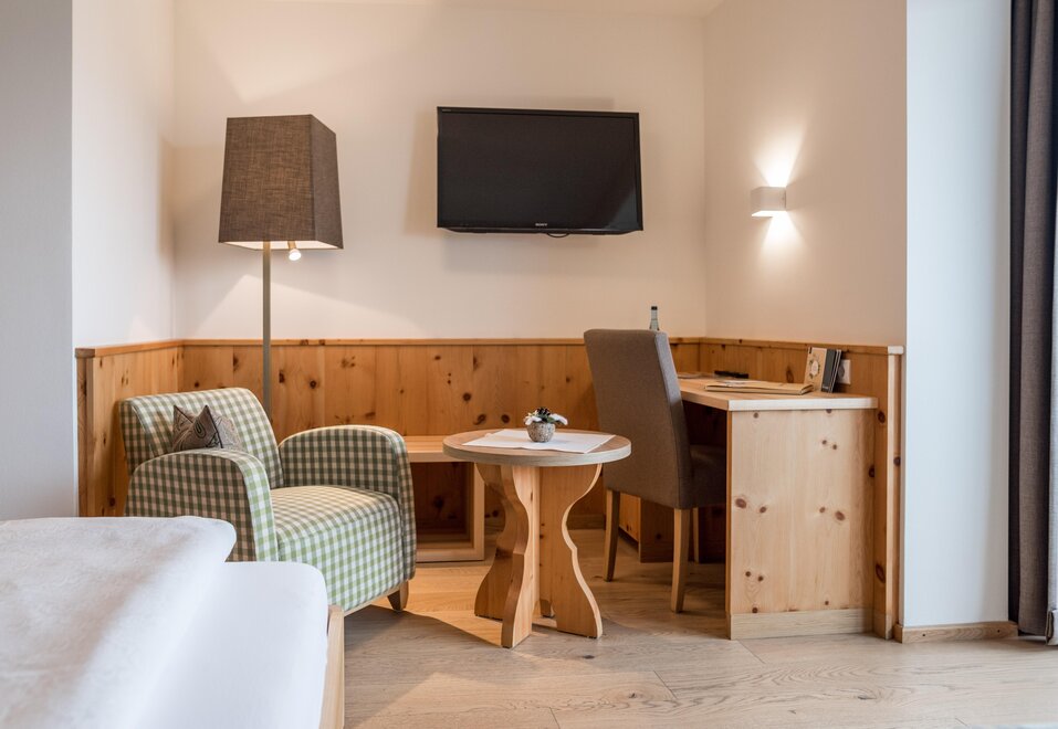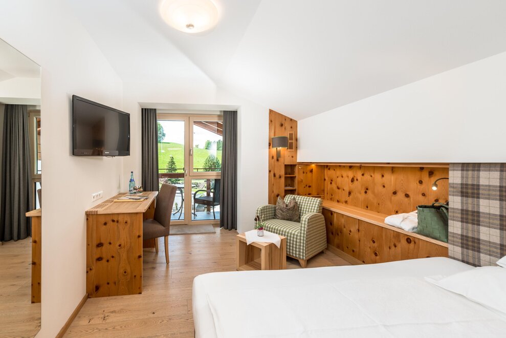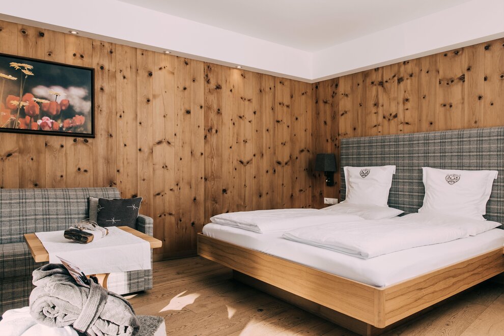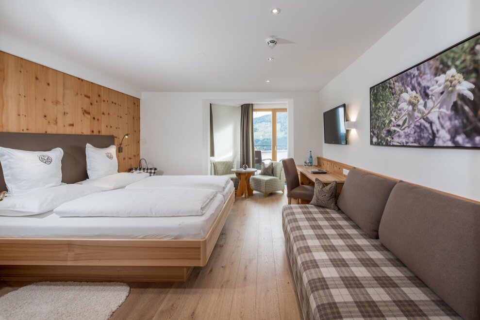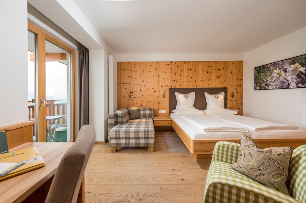Double room Edelweiss set in pine wood, with shower or bath tube, balcony, Flat-TV, Safe and telephone.