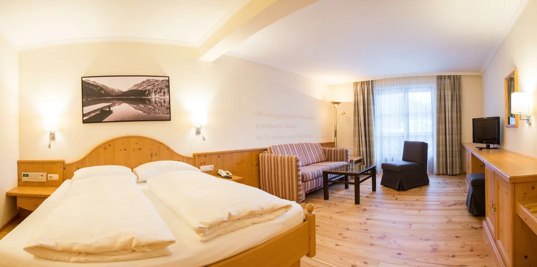 Bright and friendly room furnished with solid wood furniture