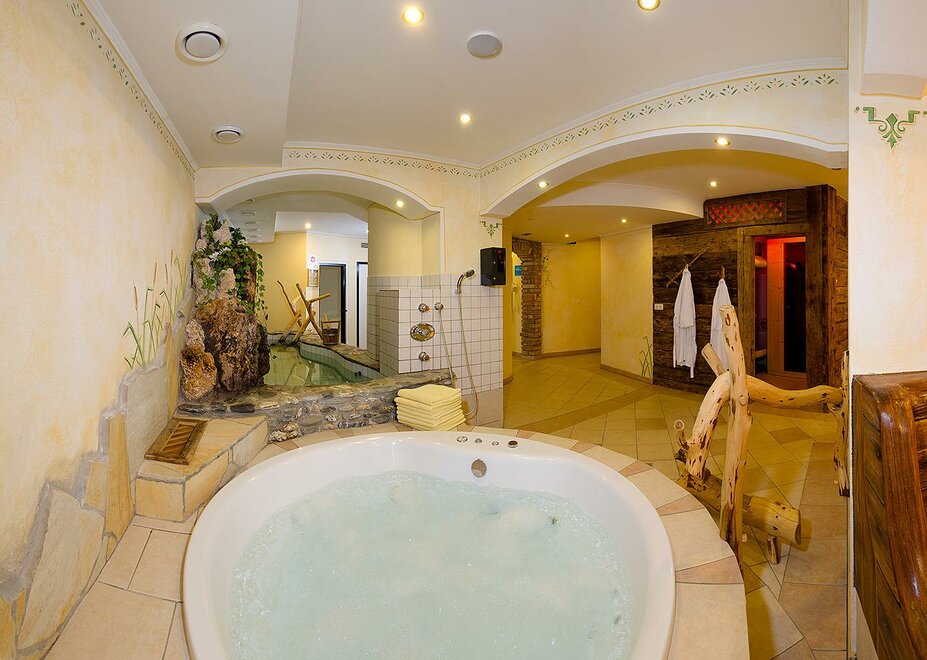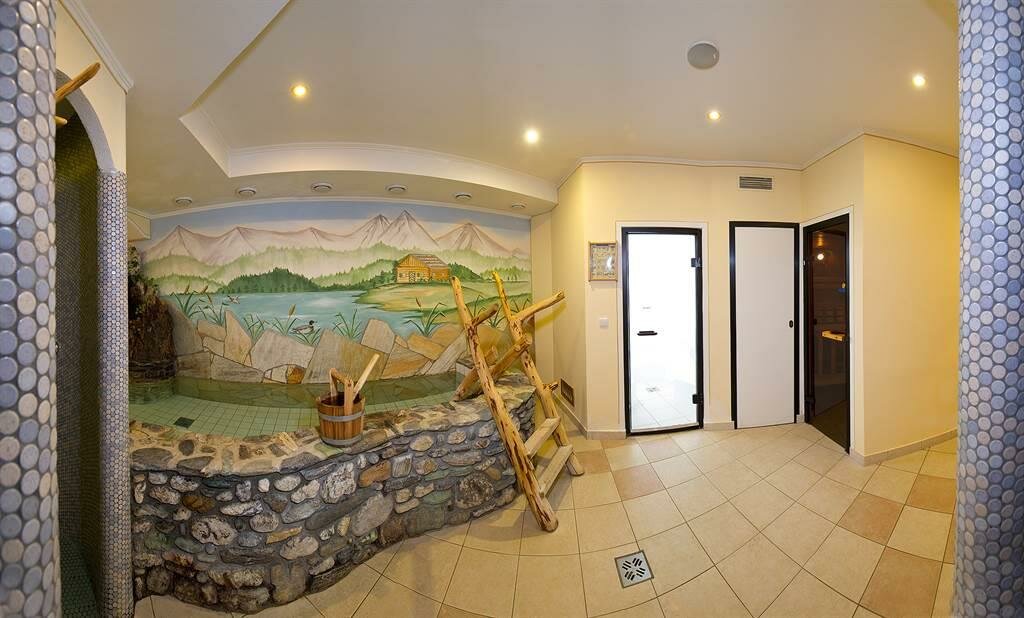 sauna (140 m²), steam bath, kneipp sink, whirlpool, experience showers, solarium, heat bank, large quiescent space. Children's game space with Play station and many plays, table tennis and -football, house music, sledge rides, sunbathing area, children's playground.