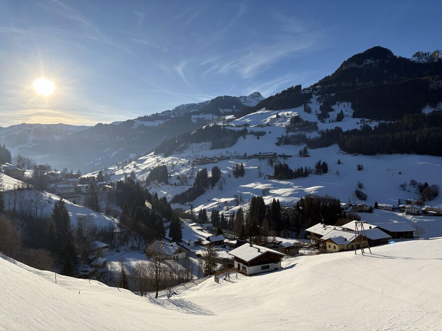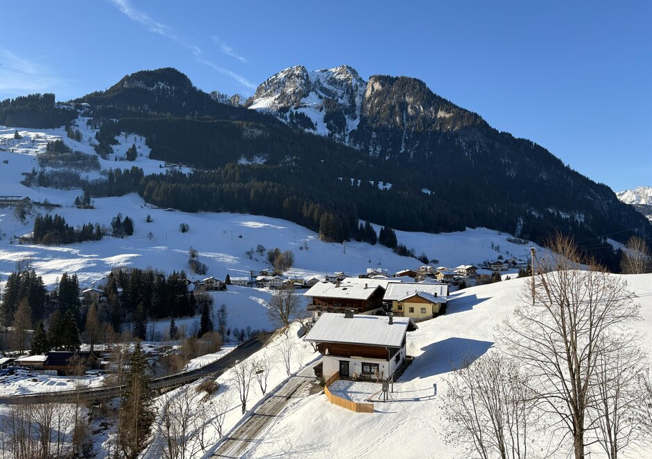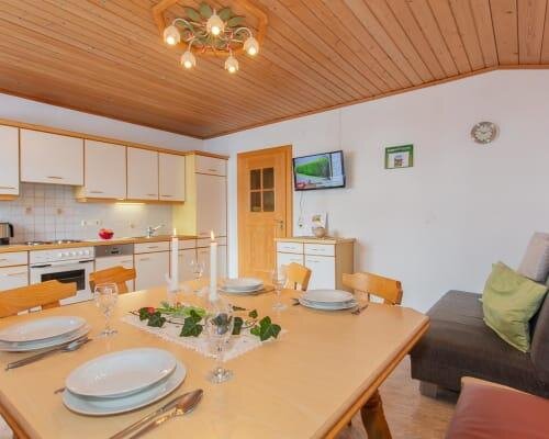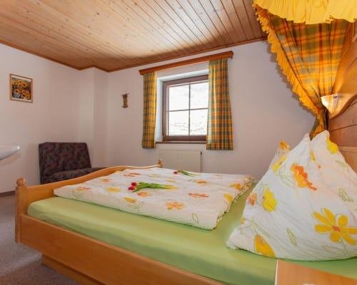 Our spacious “Sonnenschein” holiday apartment, furnished in a cozy country style, is perfect for a relaxing getaway in the mountains. Three comfortable bedrooms offer plenty of space: one with a double bed and single bed, one with two single beds, and one with a double bed and an extra sofa bed. Each bedroom has its own washbasin. Bathroom and toilet are separate; a washing machine is available for an additional fee.