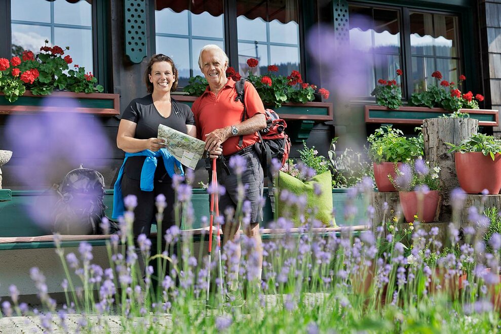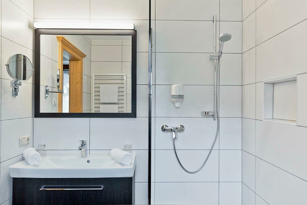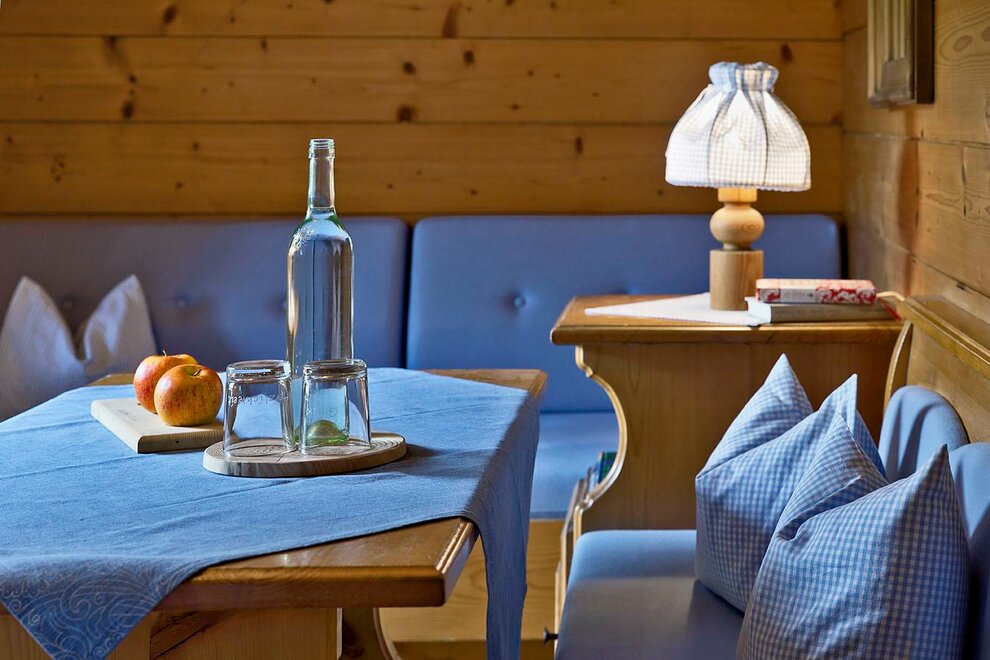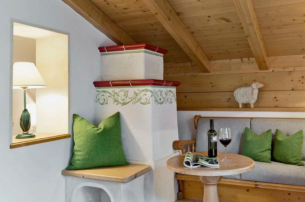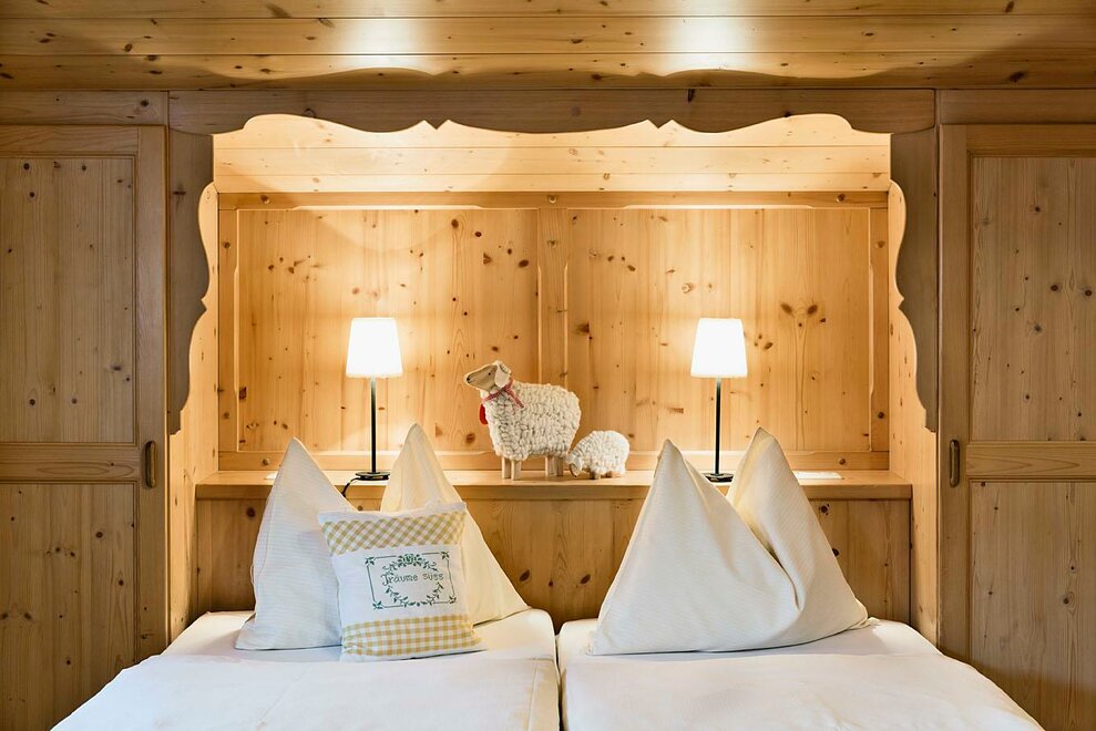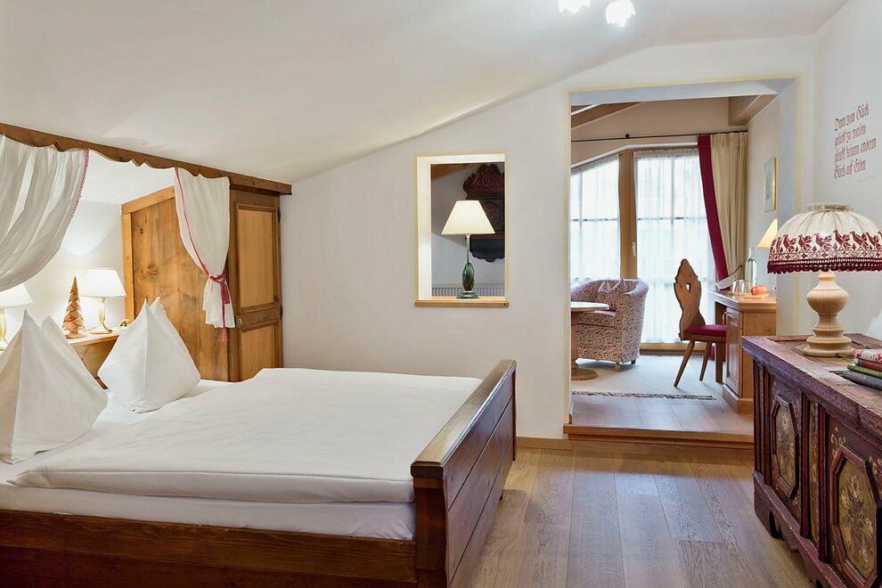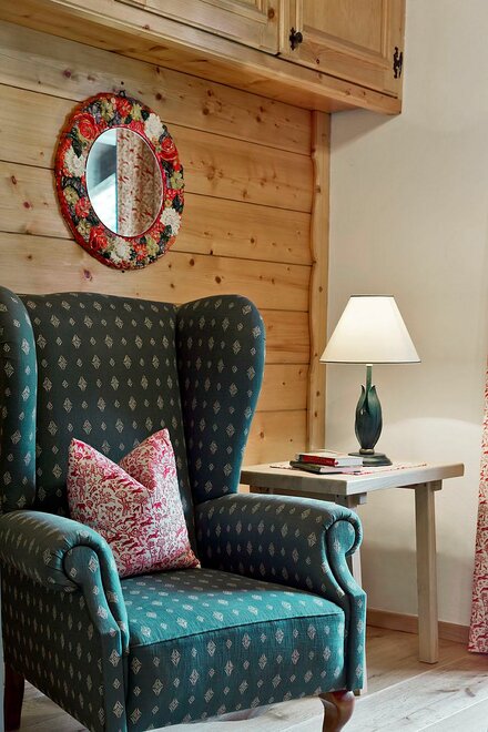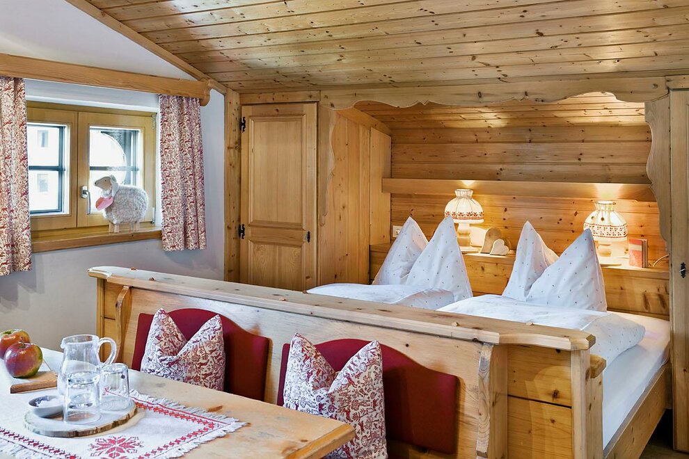 A 23-25 m² cozy double room with a south or southwest-facing balcony. It features a comfortable couch or armchairs made of soft wool, covered with warm sheepskins and a cozy woolen carpet. Cushions made of natural linen, charming sheep paintings by artist Regina Uedl. Oak wood flooring, bathroom with shower or bathtub, toilet, cosmetic mirror, hairdryer, bathrobe, sauna basket and towels, satellite TV, and Wi-Fi.