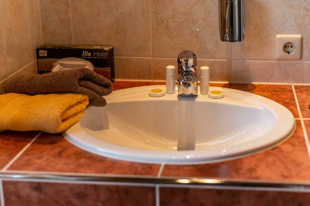 Cosy single room with full wooden furniture, shower and toilet mostly separated, hair dryer, cable TV, radio alarm clock, WLAN, balcony with seating and table.