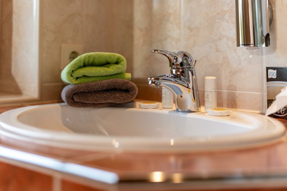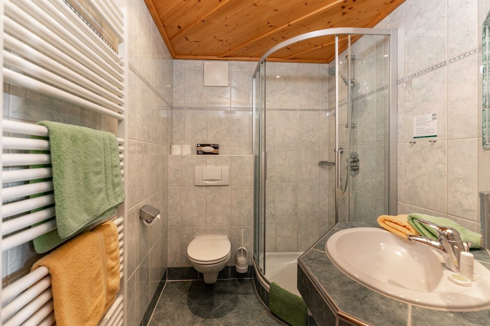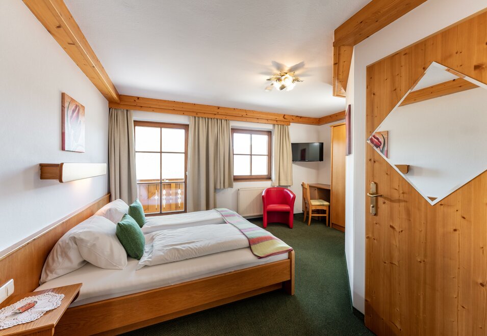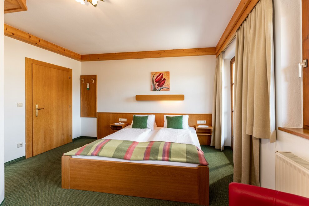 Cosy double room with full wooden furniture, shower and toilet mostly separated, hair dryer, cable TV, radio alarm clock, WLAN, balcony with seating and table, on request with baby or child equipment.
