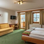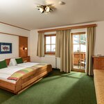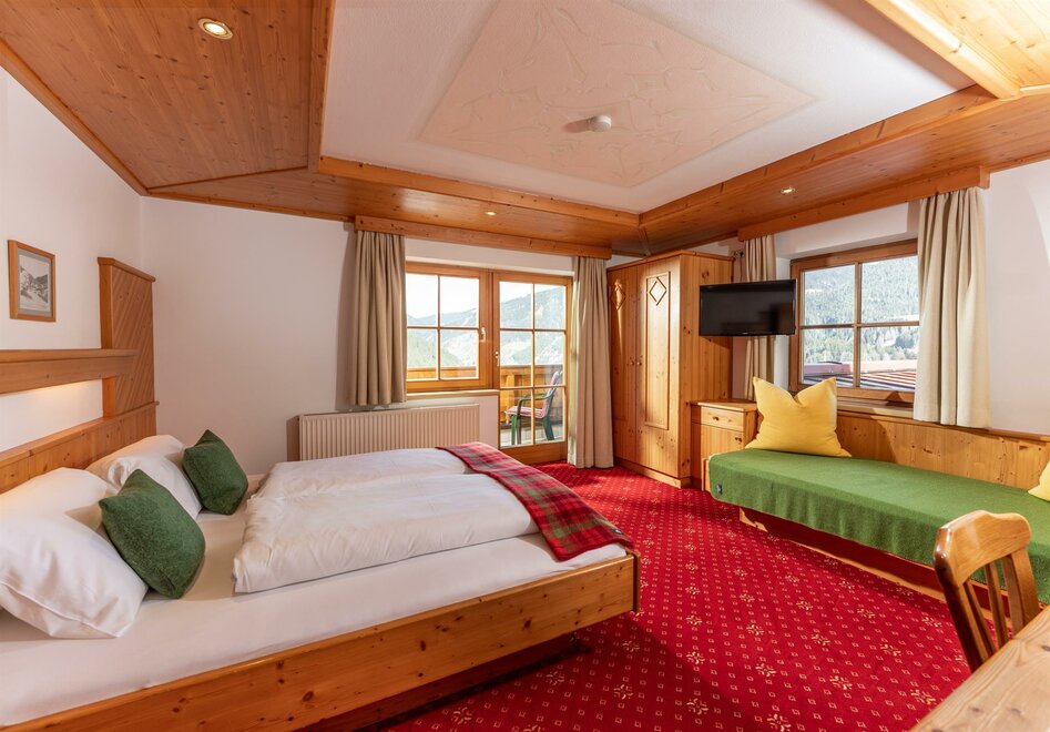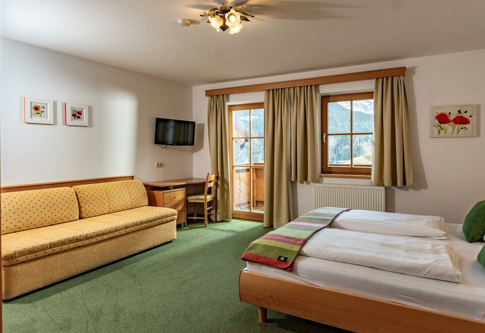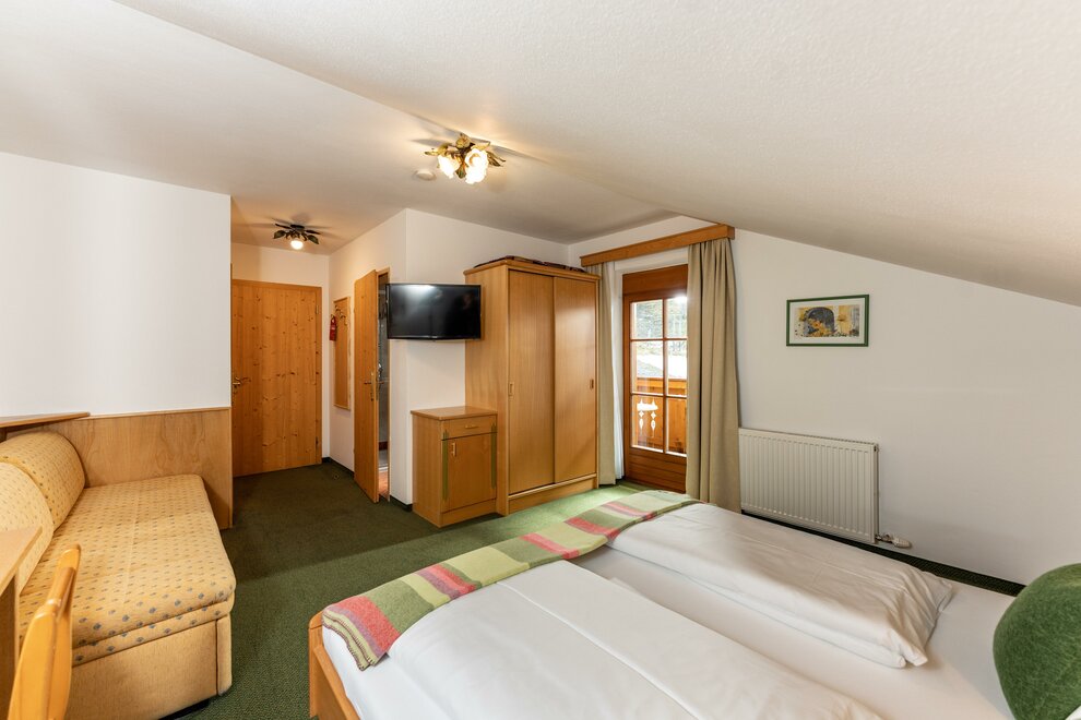 Cosy, spacious family room (1 room) with full wooden furniture and pull-out sofa bed, shower and toilet mostly separated, hair dryer, cable TV, radio alarm clock, WLAN, balcony with seating and table, on request with baby or child equipment, bookable as triple or quadruple room