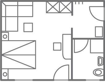 Single room type A is also possible for 2 persons, with shower/wc, desk and balcony ca. 15m².