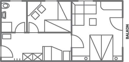 Family-suite type C - one room wiht doublebed and cosily lounge, one room with bunk bed, livingroom and shower/wc. From the balcony you have a magnificent view to the mountain.s. ca. 35m². Please ask for a discount for children!!