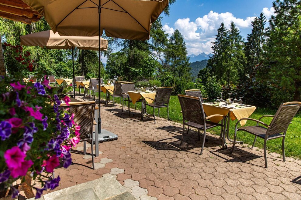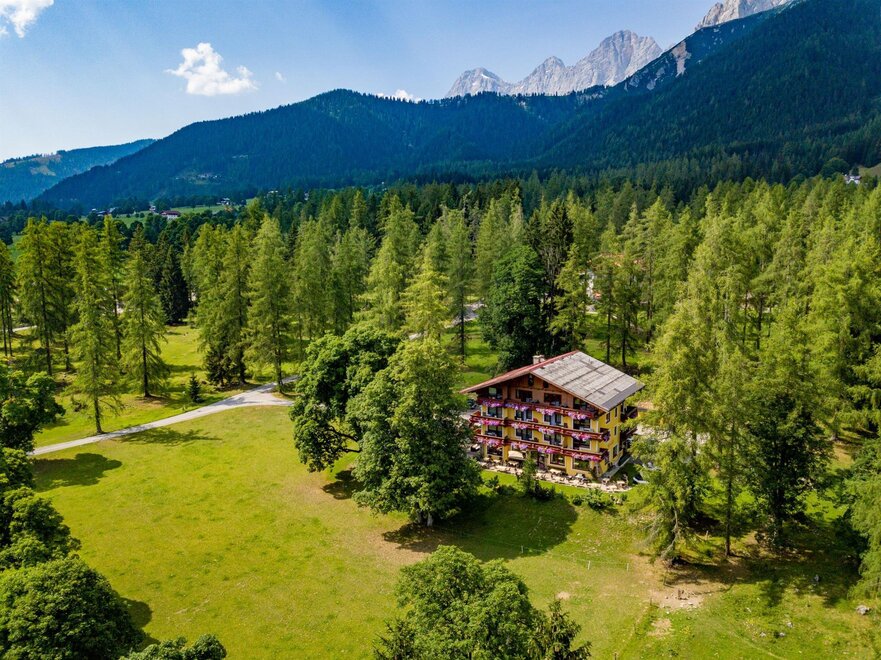 Doppelzimmer Dachstein mit Blick auf die imposanten Dachstein-Südwände; gemütliches Doppelbett mit komfortablen Matratzen, Schreibtisch, Couch, Kabel-TV, Radio, schönes Badezimmer mit Dusche und WC, Balkon