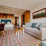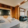 Spacious living, kitchen and dining area with cosy seating area in modern alpine style