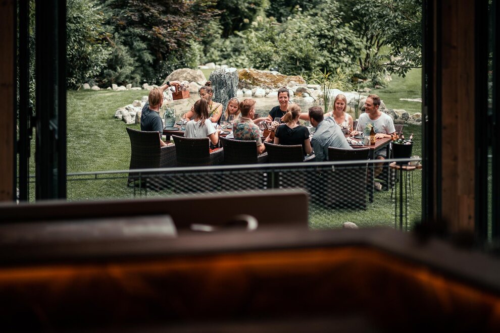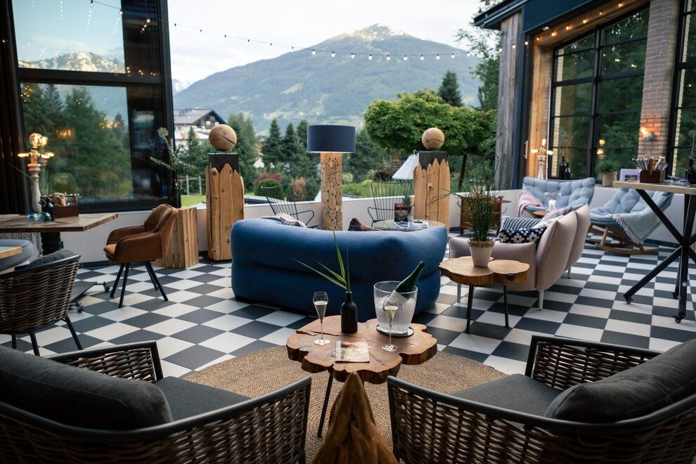 Large terrace with garden access for the magnificent south-east view of the Gastein mountains