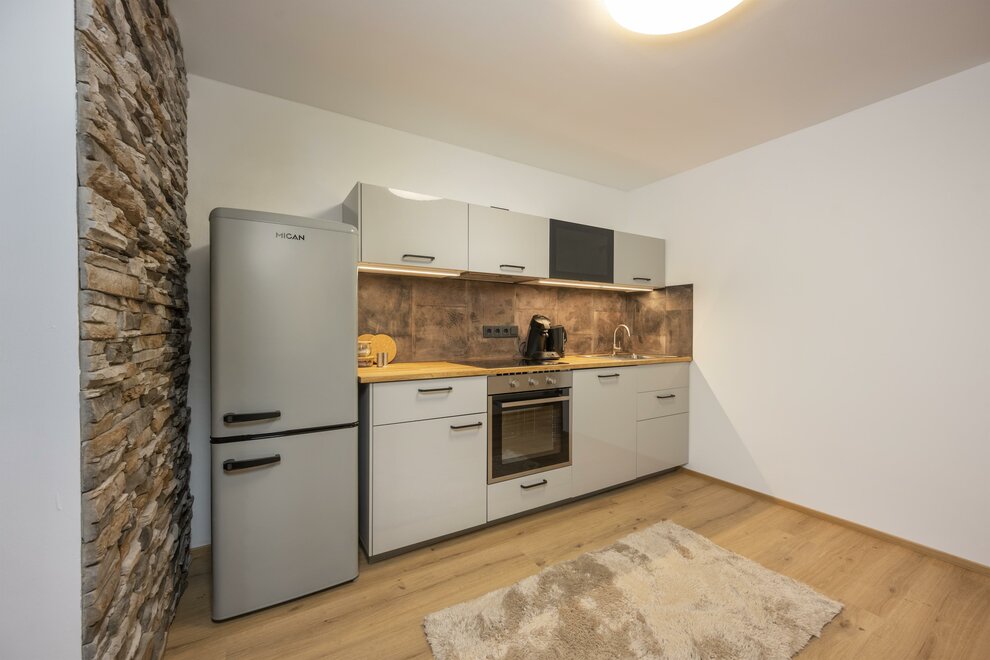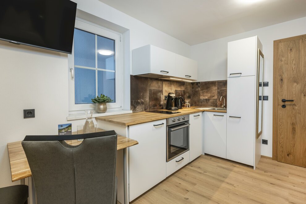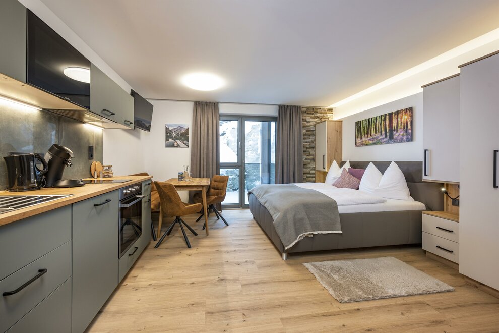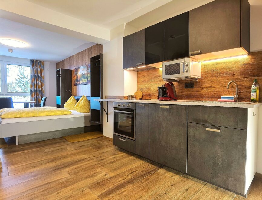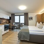 The modern furnished and cozy studio apartment for 2 persons has 1 living-bedroom with fully equipped kitchenette, 1 bathroom with shower, 1 separate toilet and a balcony with a wonderful panoramic view. Studio size: 25 m²