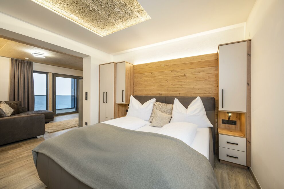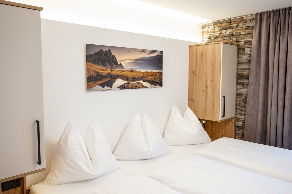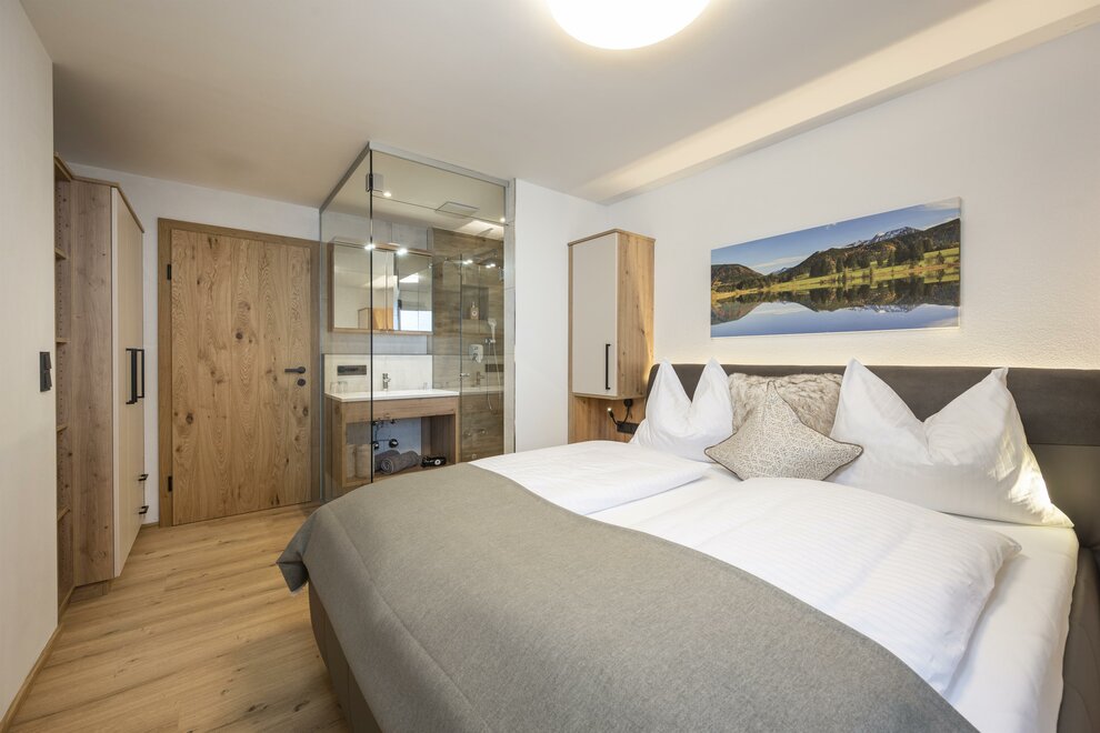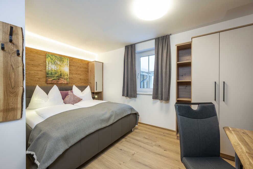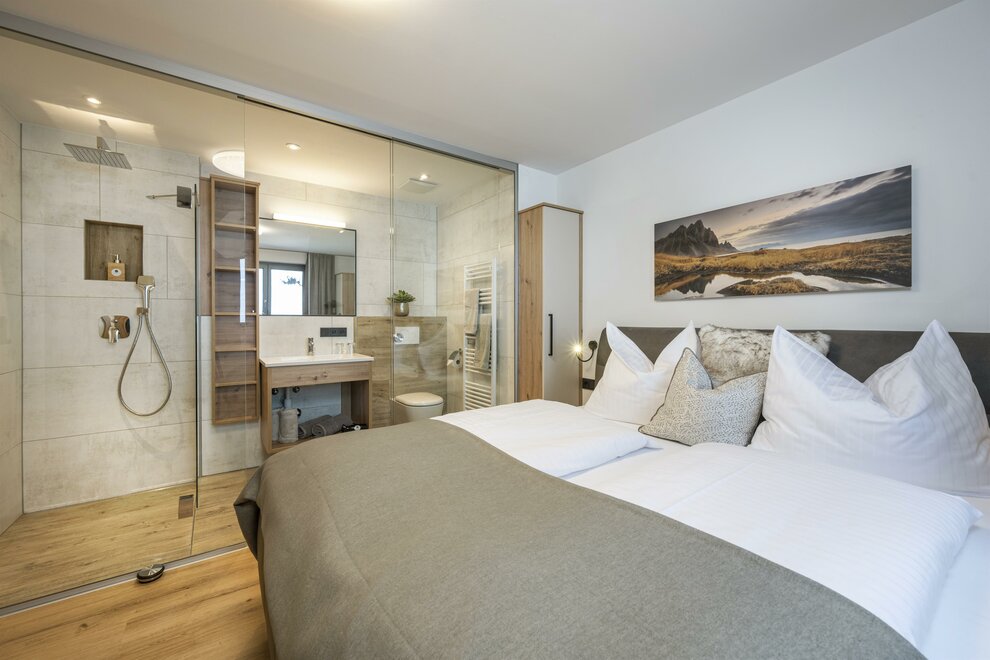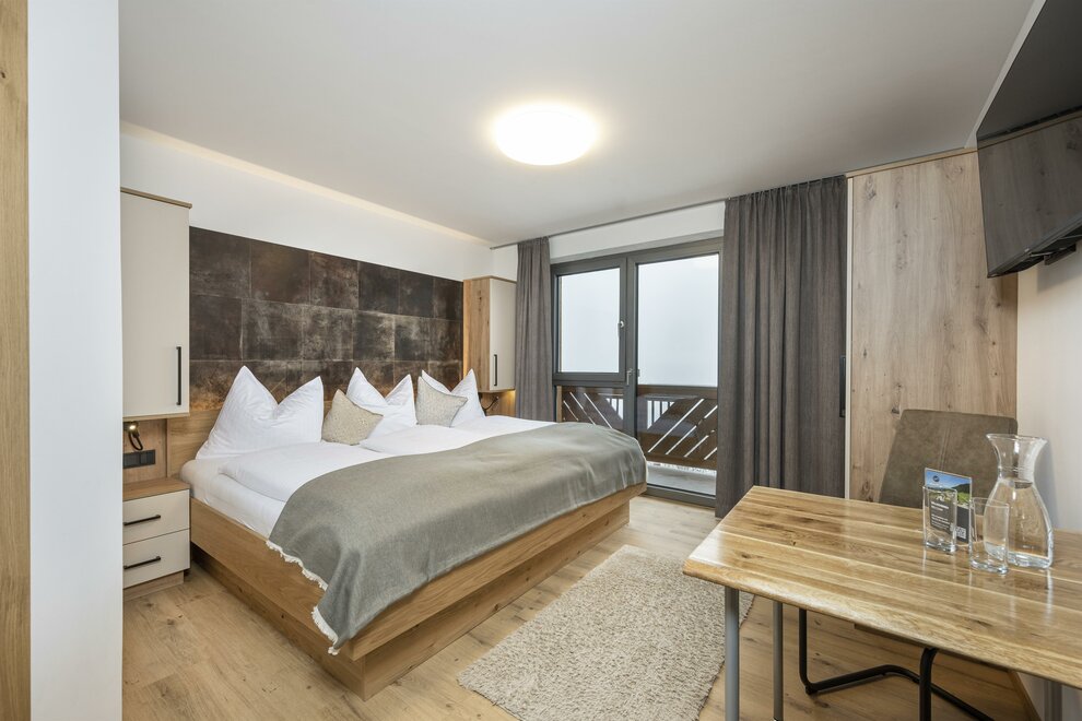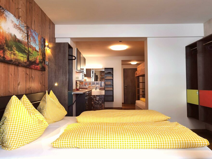 The modern comfort room is equipped with a large family bed (240 cm wide) that can accommodate up to 3 people. It has 1 bathroom with shower & toilet and a balcony with a wonderful panoramic view. On request extendable for up to 6-7 persons.
