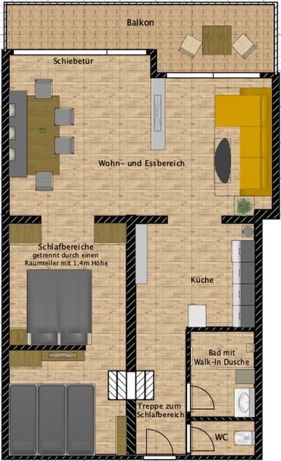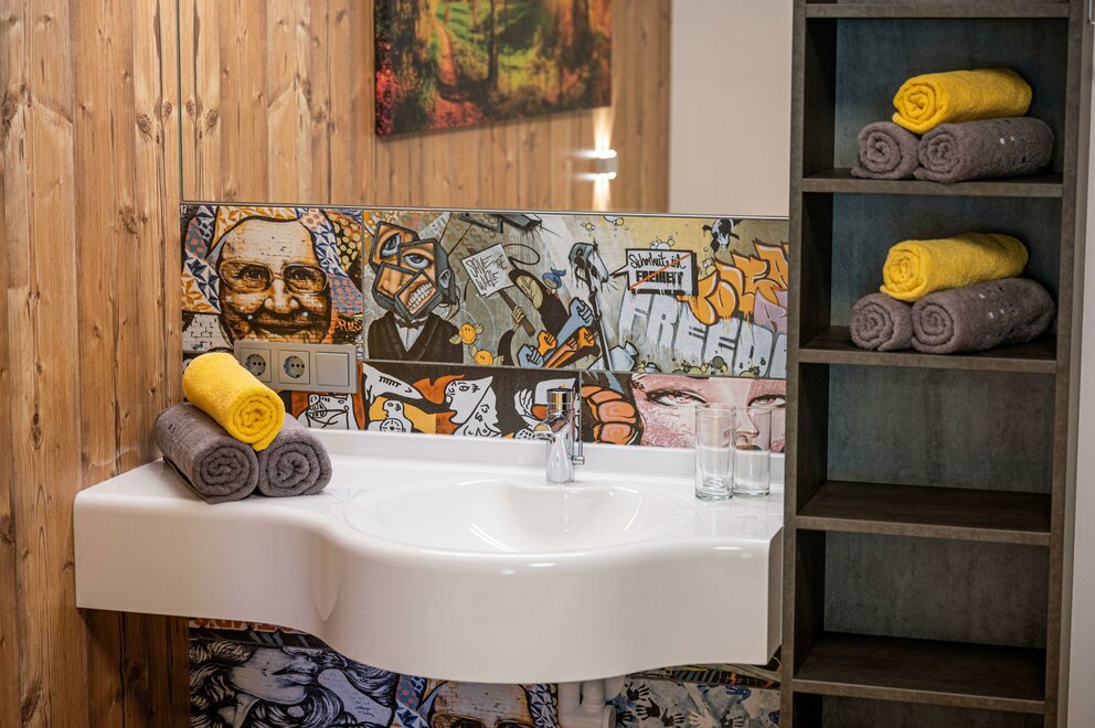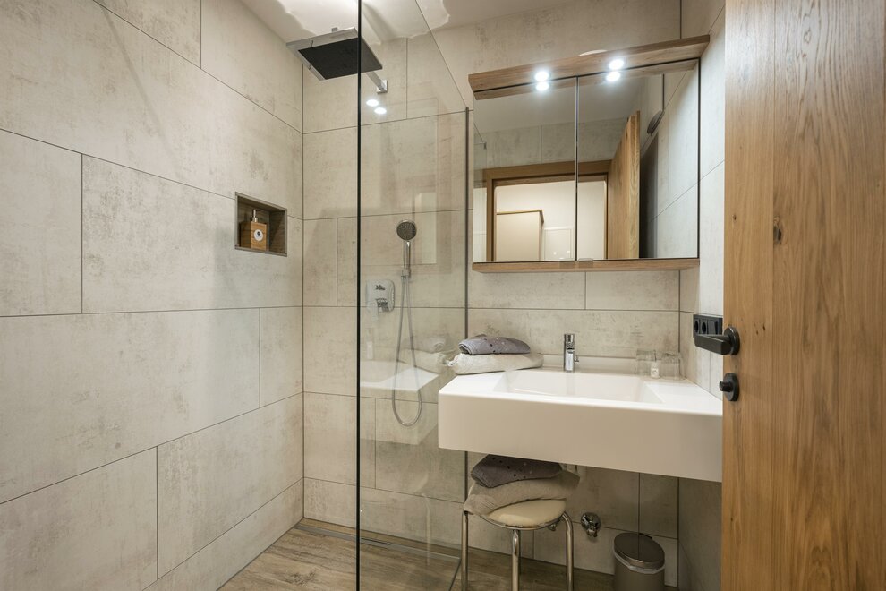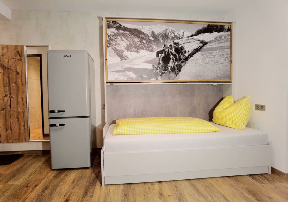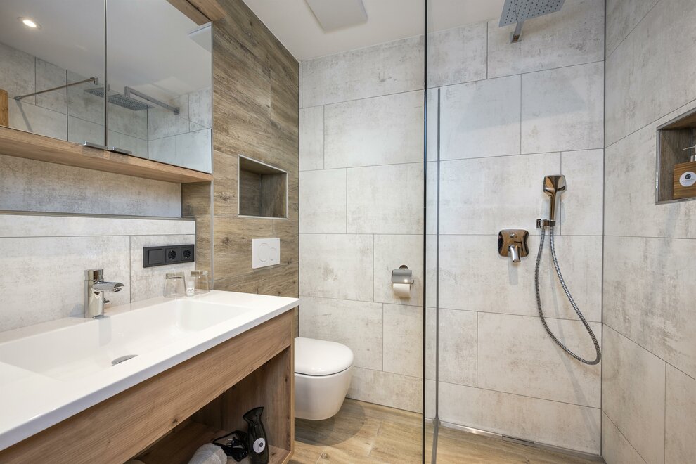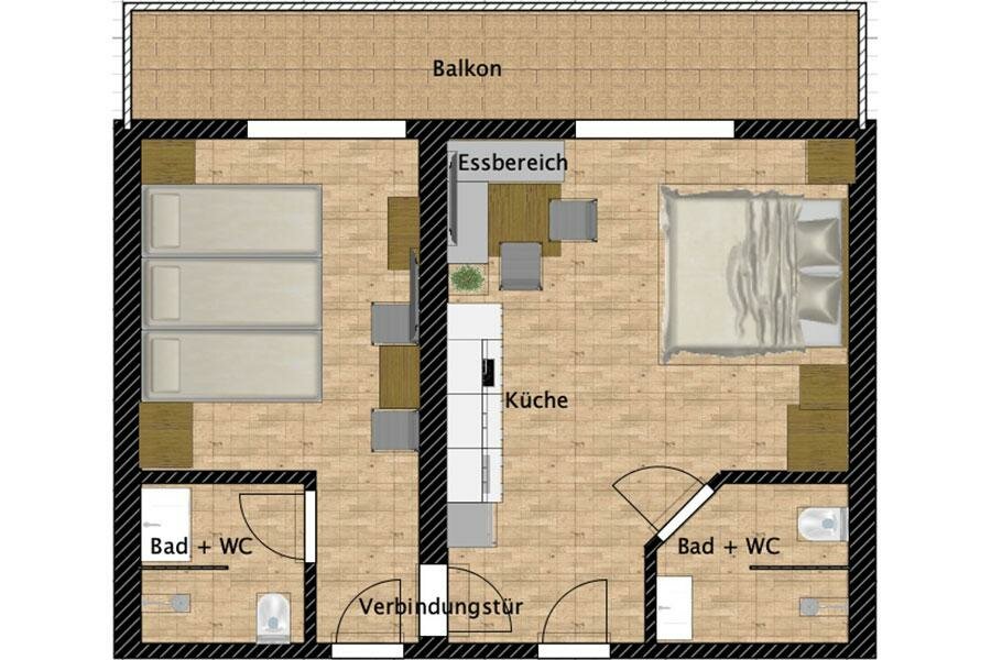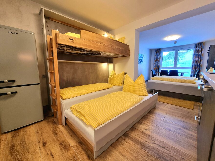 The modern comfort room is equipped with a large family bed (240 cm wide) that can accommodate up to 3 people. It has 1 bathroom with shower & toilet and a balcony with a wonderful panoramic view. On request extendable for up to 6-7 persons.