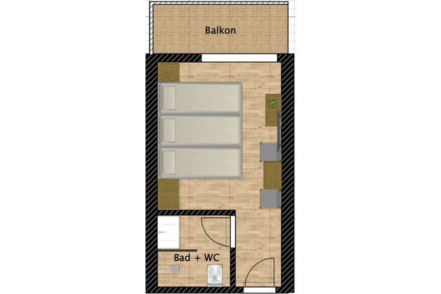 It has 1 bathroom with shower & toilet and a balcony facing north. On request it can be booked with a studio+connecting door 4-5pers.Room/apartment features