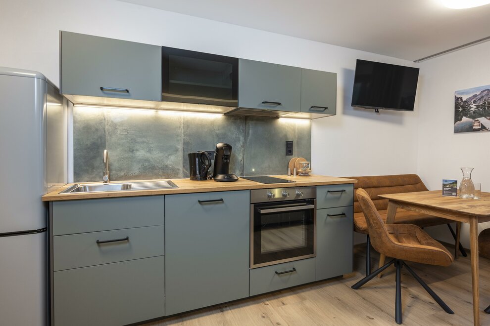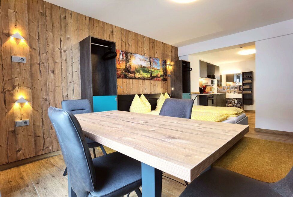 Modern equipped studio for 4 persons. 1 kitchen-living room, 1 sleeping area, 1x bath/shower and 1 separate WC. The sleeping area is separated by a partition and equipped with two double beds. South-facing balcony with fantastic panoramic view
