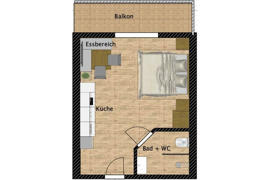 The modern furnished, spacious studio apartment for 2 persons has 1 living-bedroom with fully equipped kitchenette, 1 bathroom with shower, 1 separate WC and a balcony with a fantastic panoramic view. Studio size: 40 m²