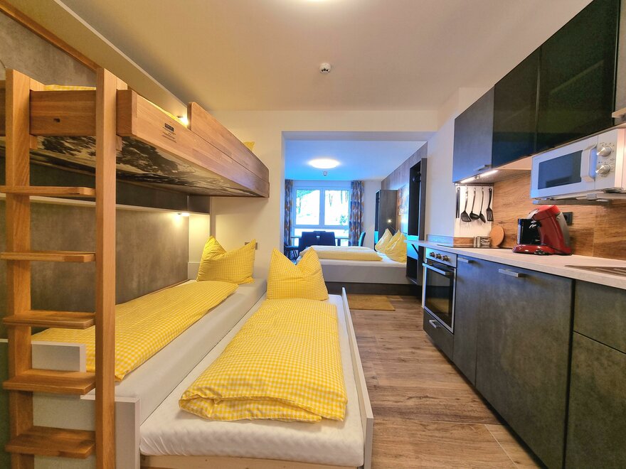 The modern studio for 5 persons has 1 kitchen/living room, 1 sleeping area with 1 double bed +1 wide family bed (240 cm), 1 bathroom and 1 separate WC. The sleeping area is separated by a partition wall. South-facing balcony -fantastic panoramic view