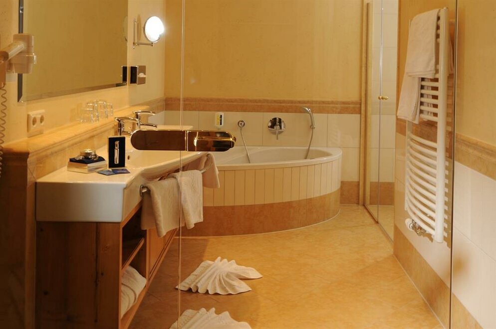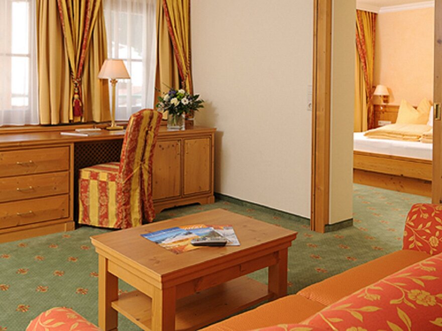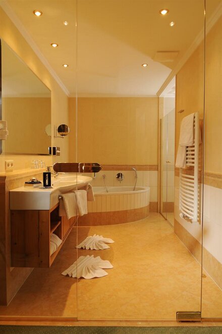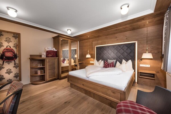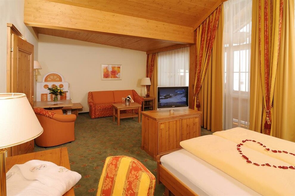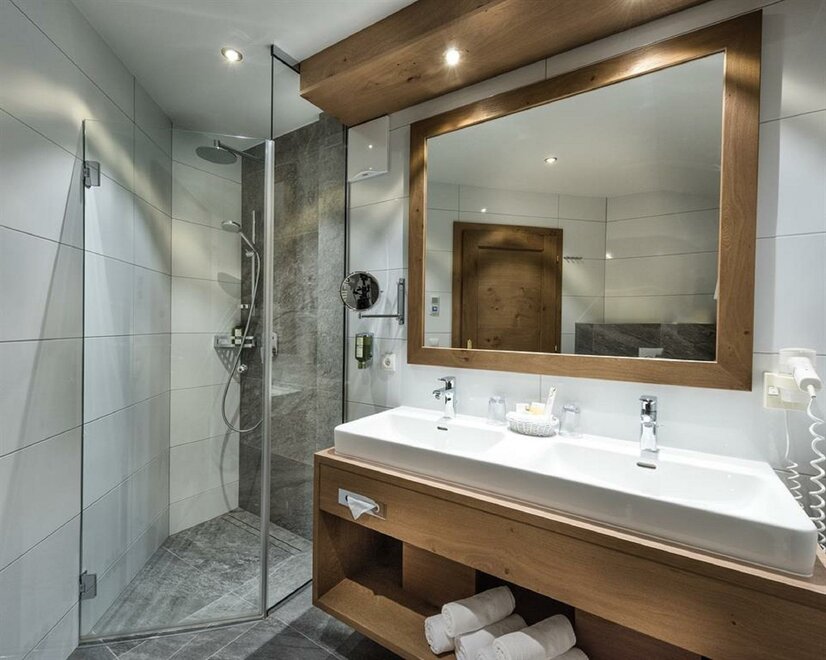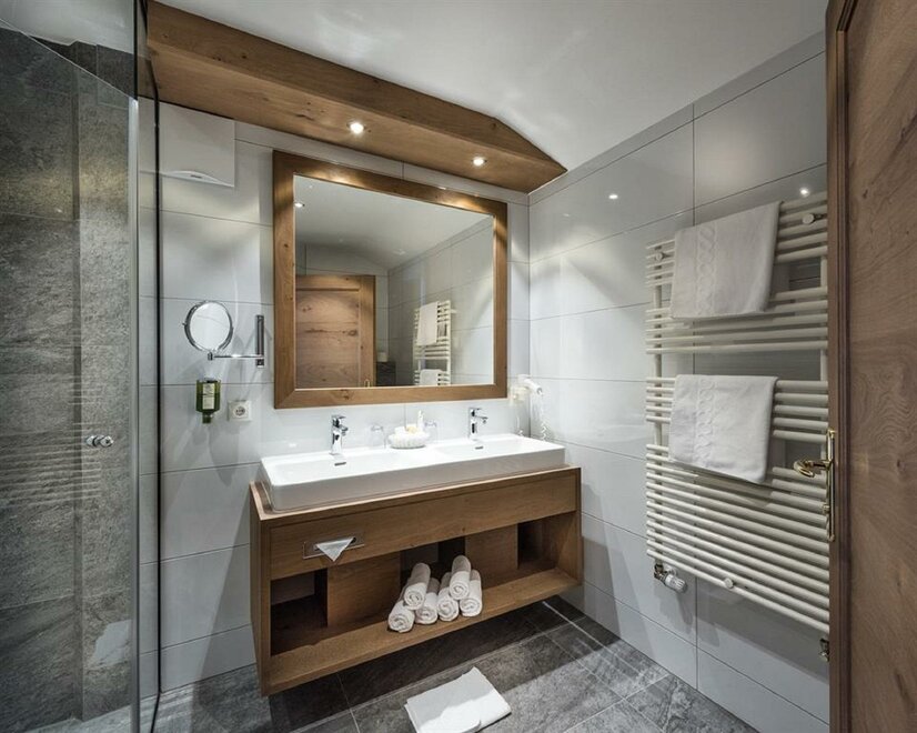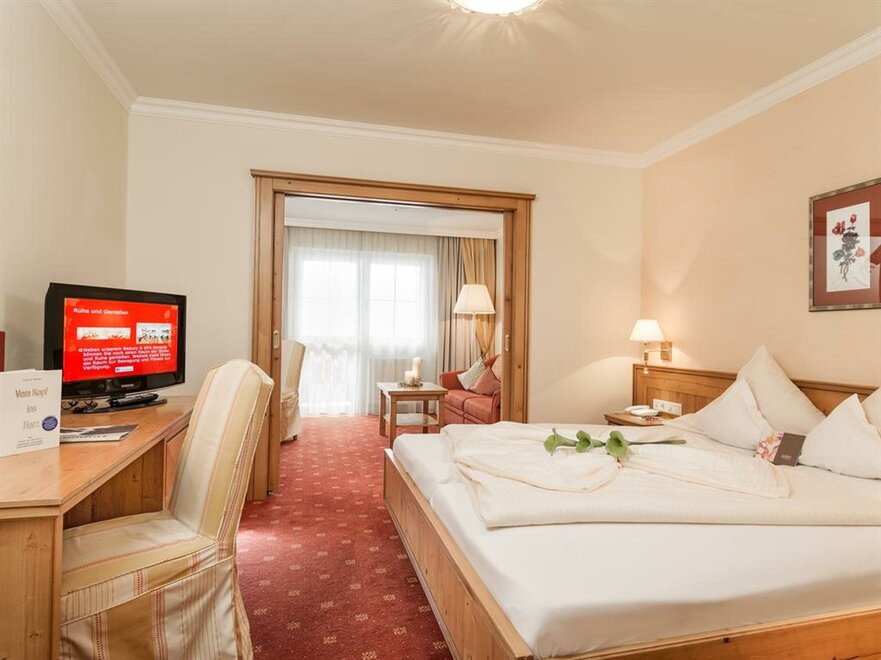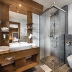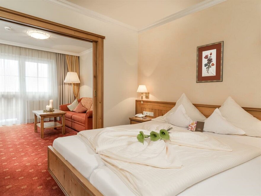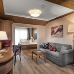 Balcony, sun-drenched suite, decorated in light spruce, elegant bedroom and own generous living area with sofa-bed, stylish bathroom with double washbasins, shower, separate WC.living in a suite “Alpine residence”, approx. 50sqm,