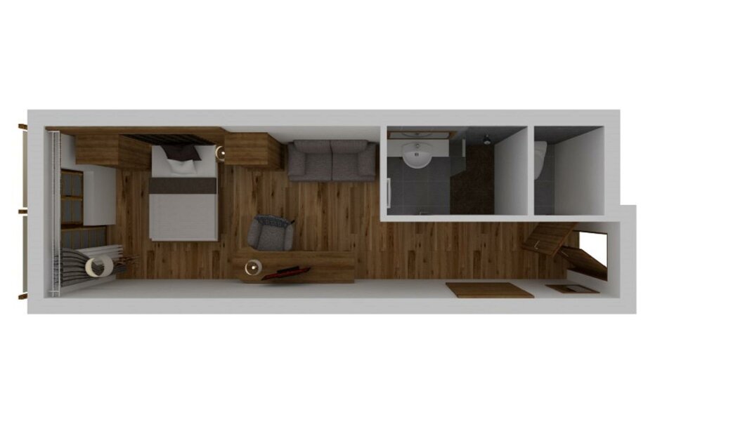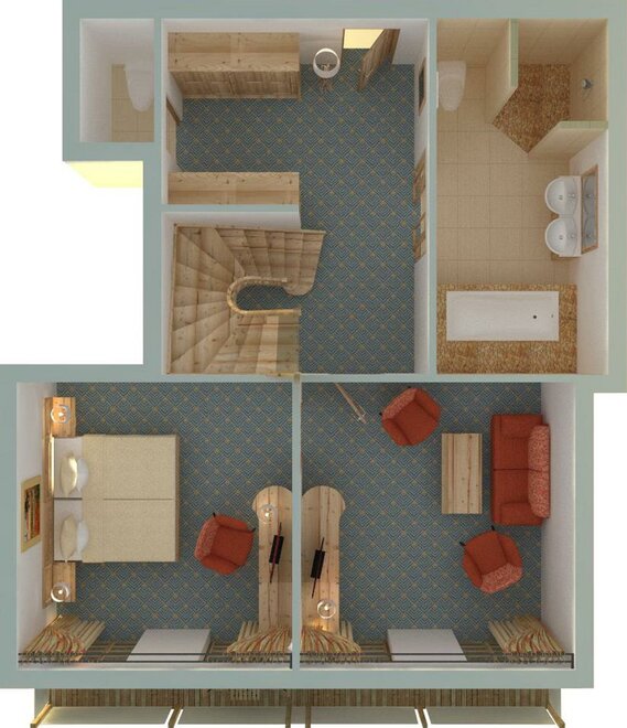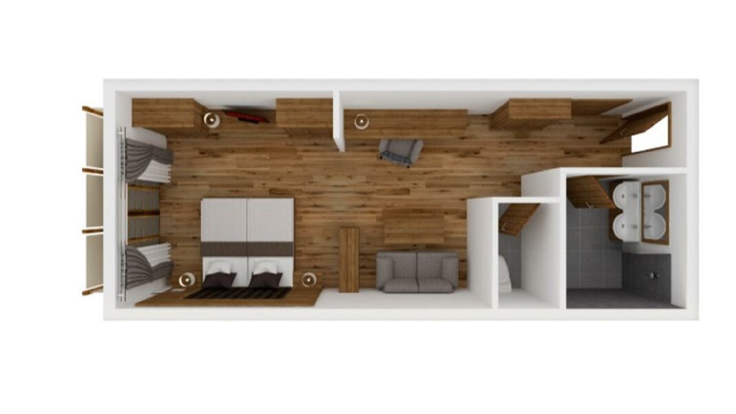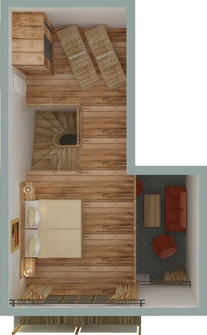 a two storeyed suite with two sleeping rooms and private infrared cabin