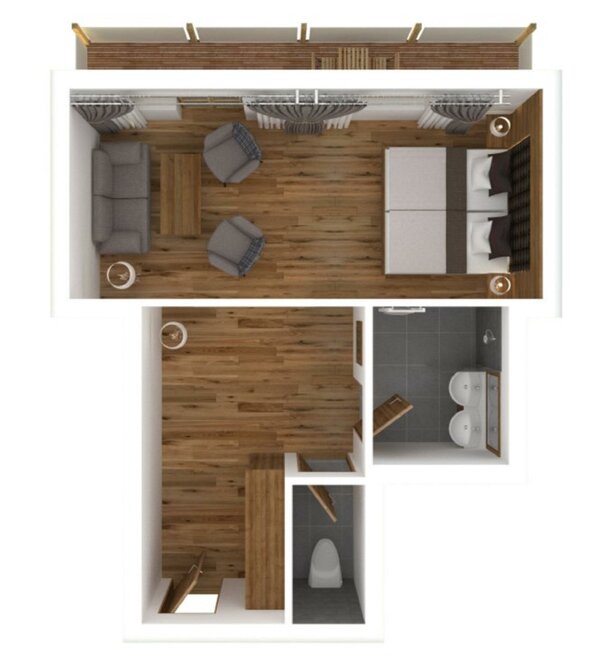 living in a suite “Mountain world”, approx. 38sqm lot of space. Balcony, Quiet suite, top-quality, through a sliding door the spacious living area becomes a partition able area with double sofa-bed, bathroom (double washbasins,shower, seperate WC)