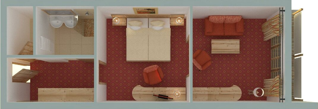 Charming and bright suite, decorated in bright, top-quality spruce and friendly fabrics, through a sliding door the spacious living area becomes a partition able area with double sofa-bed. Perfect for family holidays.