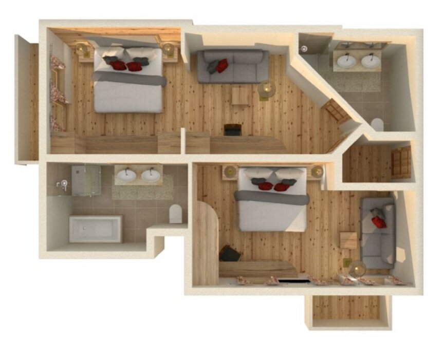 Suite decorated in light spruce with ample room to stretch out, with 2 sunny bedrooms, spacious living room with cosy sitting area and double sofa-bed, two bathrooms with double washbasins, bathtub shower, separate WC.Room/apartment features