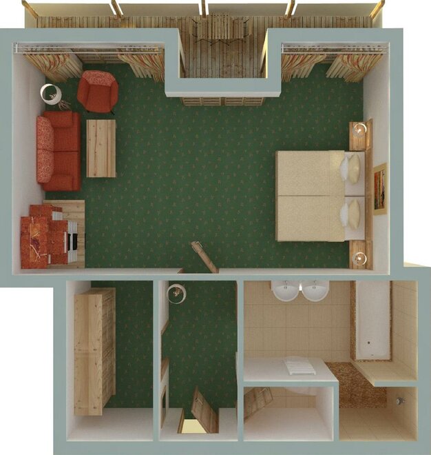 sofa-bed, comfortable dressing room, panoramic glass frontage to the bathroom(corner bathtub , separate WC).living in a suite “Mountain crystal”, approx. 45-40sqm, pure idyll
