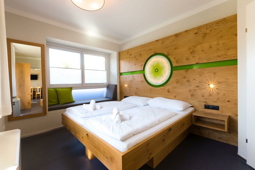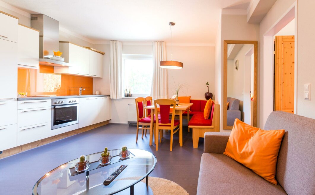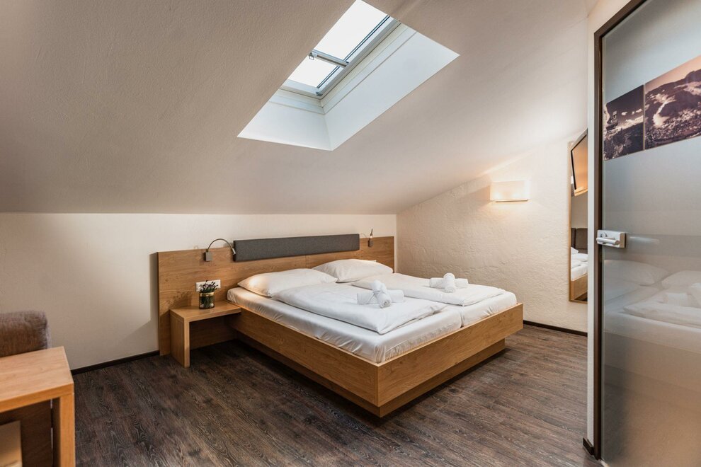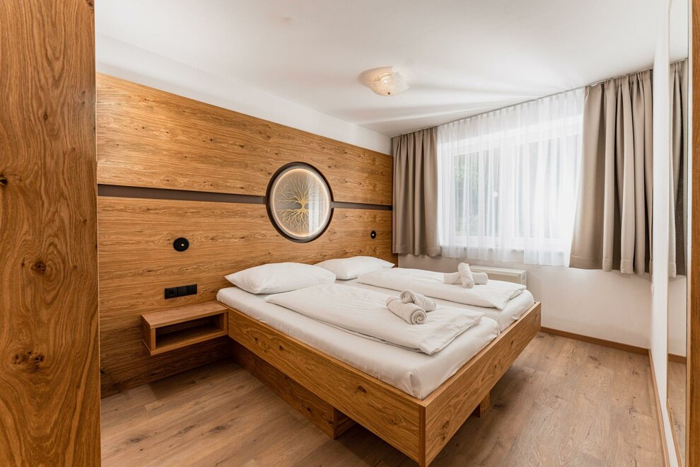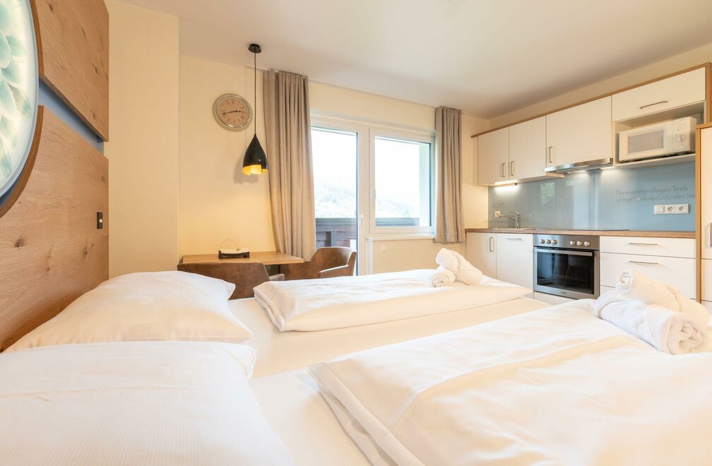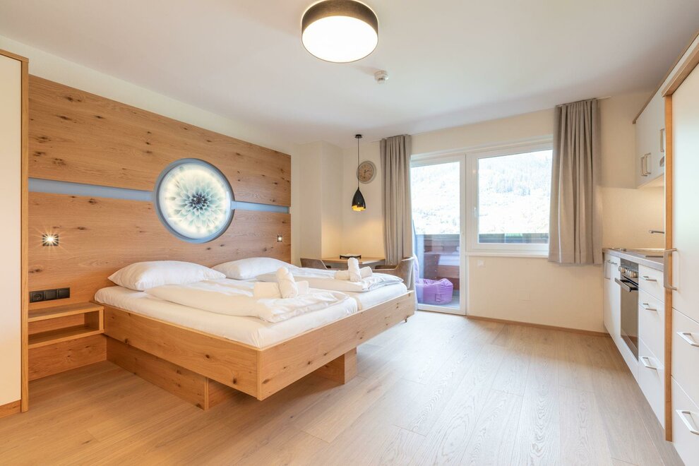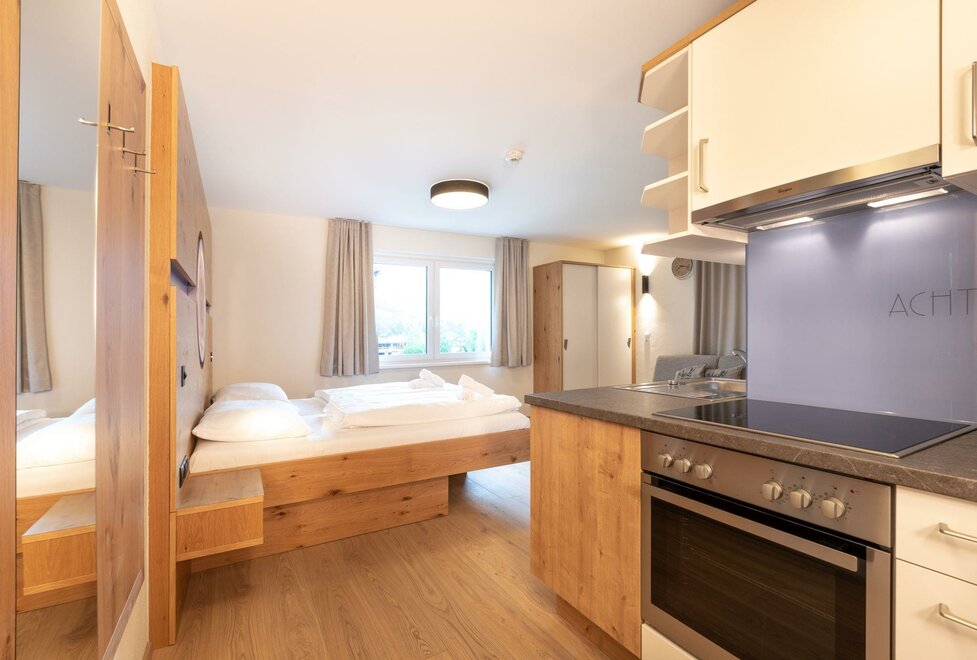 Our smaller apartments are available in the category Studio Family with balcony. The apartment space measures approximately 30m², has a balcony and can comfortably accommodate 2-4 guests. The apartment has a king size bed, a two seater couch, as well as a fully equipped kitchen. Fresh bed linen and towels are naturally included. The balcony faces the finishing slopes of the Planai.
