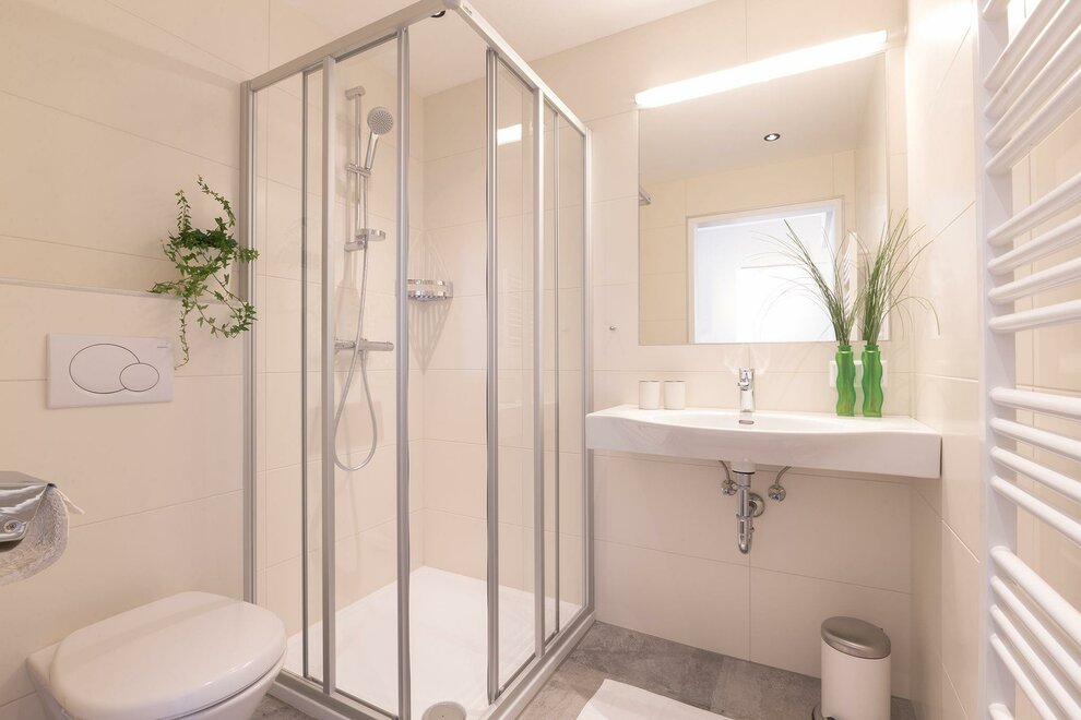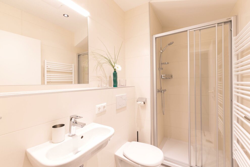 With our 5 apartments in the category Apartment 2 Bedroom partly balcony, either on the ground floor or on the second floor, a modern equipped apartment measuring approximately 65m², suitable for 4-6 guests. The division of rooms is ideal: Every apartment has two double bedrooms with a king size bed, and their own bath/WC, as well as a fully equipped kitchen, with a large dining table, and a two seater couch. Of course fresh bed linen and towels are made available.