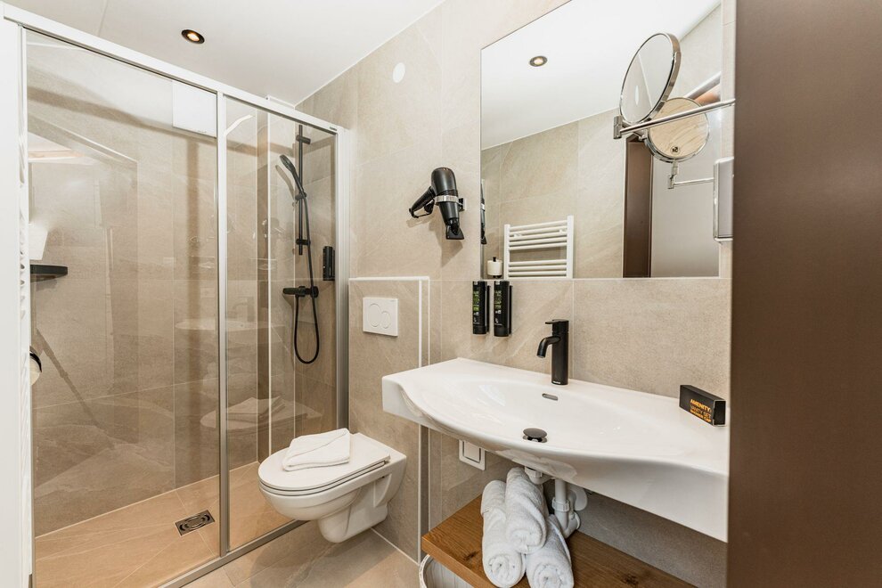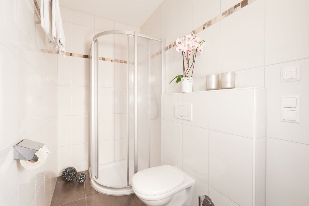 In the approximately 95 m² suite Dachsteinblick, 7 - 10 people spend a vacation of the highest quality, not only due to its location on the third floor. The spacious five-room apartment was completely renovated in September 2013 and features 4 luxuriously furnished double rooms with king-size beds, as well as 4 bathrooms with shower and toilet. In the fully equipped kitchen and the living area with a large dining table and double couch, you can enjoy delightful and sociable hours. Of course, bedding and towels are provided by us. The modern and stylishly designed apartment lives up to its name Dachsteinblick with the spacious balcony.