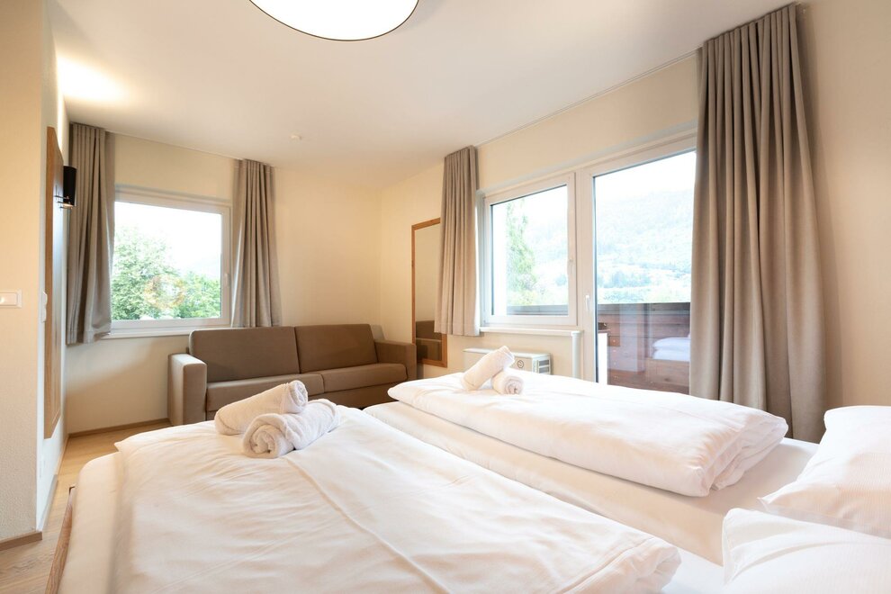 In the category Apartment Family 1 Bedroom with Balcony, you have a particularly family-friendly two-room apartment available on the second floor, where 3 – 6 people can vacation in approximately 48 m² of living space. You will find relaxation and pleasant dreams in the family bedroom with a king-size bed, double couch, and shower with toilet. The kitchen is fully equipped and offers an inviting living and dining area with a large dining table and double couch. Bed linen and towels are included. From the spacious balcony, you have a view of the impressive Dachstein massif.