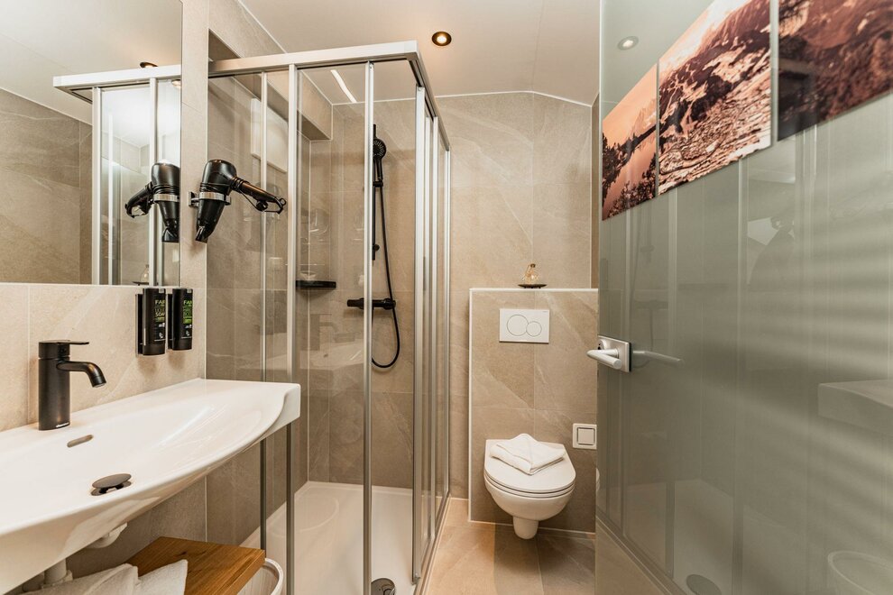 In the approximately 95m² large Suite Dachsteinblick 7-10 guests can take their holiday at the highest level, not only because it happens to be on the third floor! The spacious five room apartment was completely re-fitted in September, 2013, and possesses four luxurious double bedrooms, with king size beds, as well as four bathrooms with showers and WC’s. You can spend many enjoyable and convivial hours in the fully equipped kitchen, dining area, and living space with a double couch. Fresh bed linen and towels are all included. The modern and stylish apartment bears the name Dachsteinblick (Dachstein view) correctly, as the spacious balcony allows a wonderful imposing view of the Dachstein