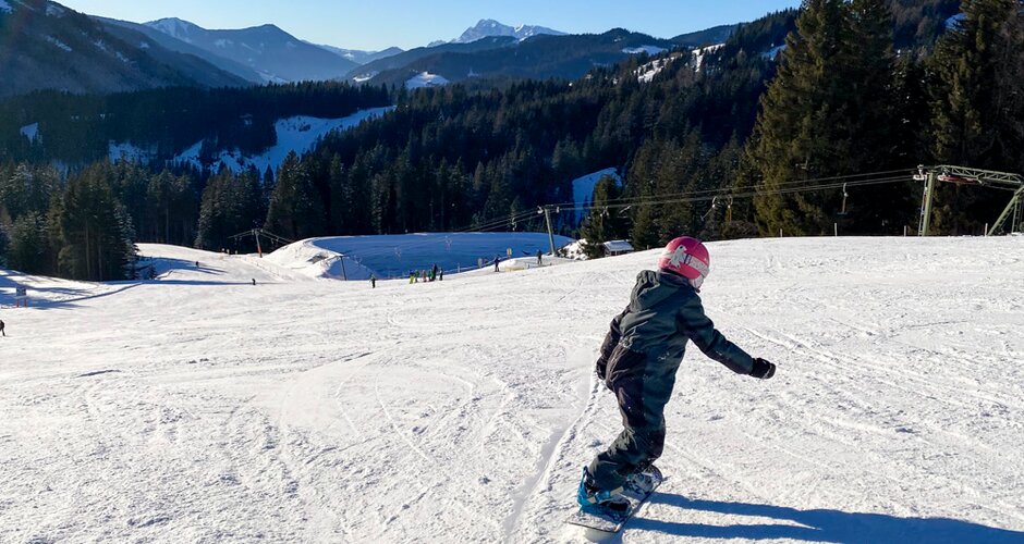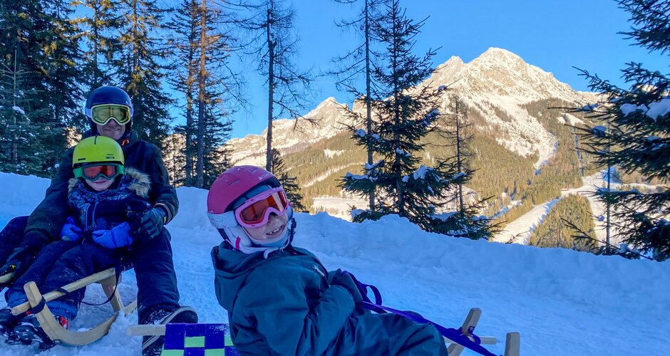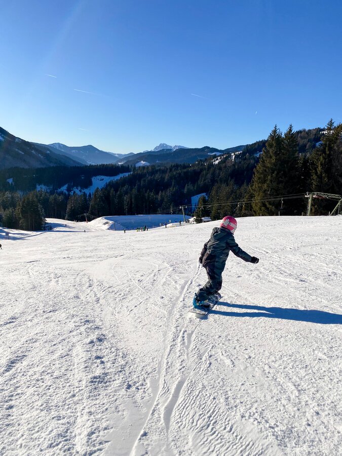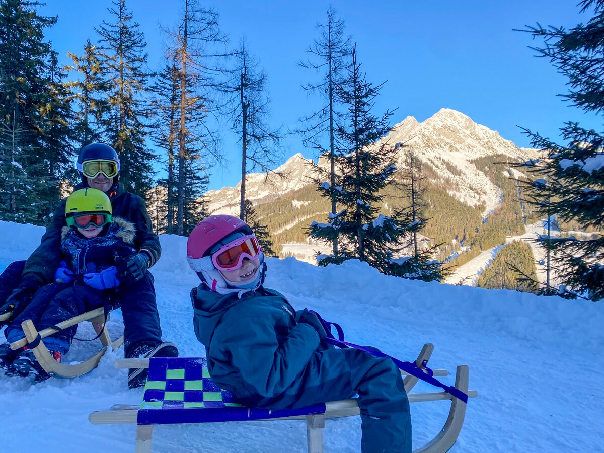So we packed our boot full of great things - in this case all our skiing, snowboarding, cross-country skiing and tobogganing equipment - and set off for snowy Filzmoos. And even though we live nearby and come here often, the mountain panorama on the journey is always amazing, even for us. "There's the Dachstein! And over there is the Bischofsmütze!" And we weren't even on the mountain yet.