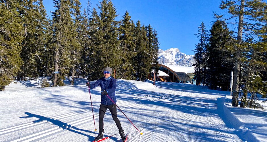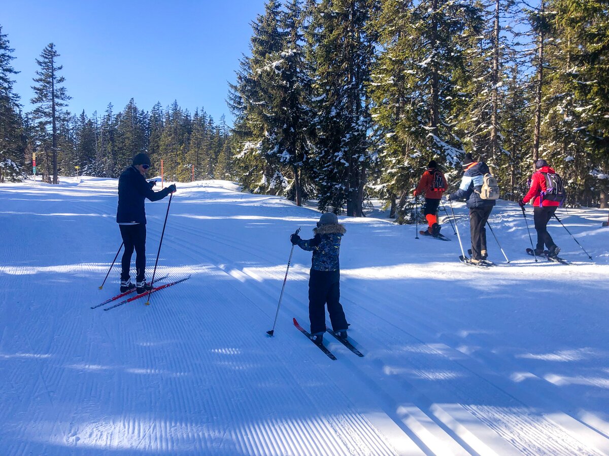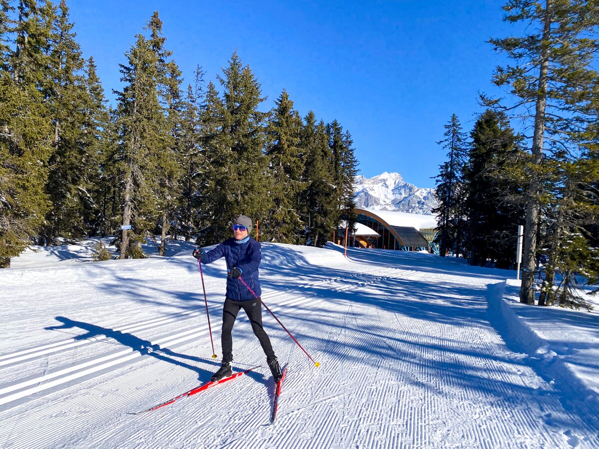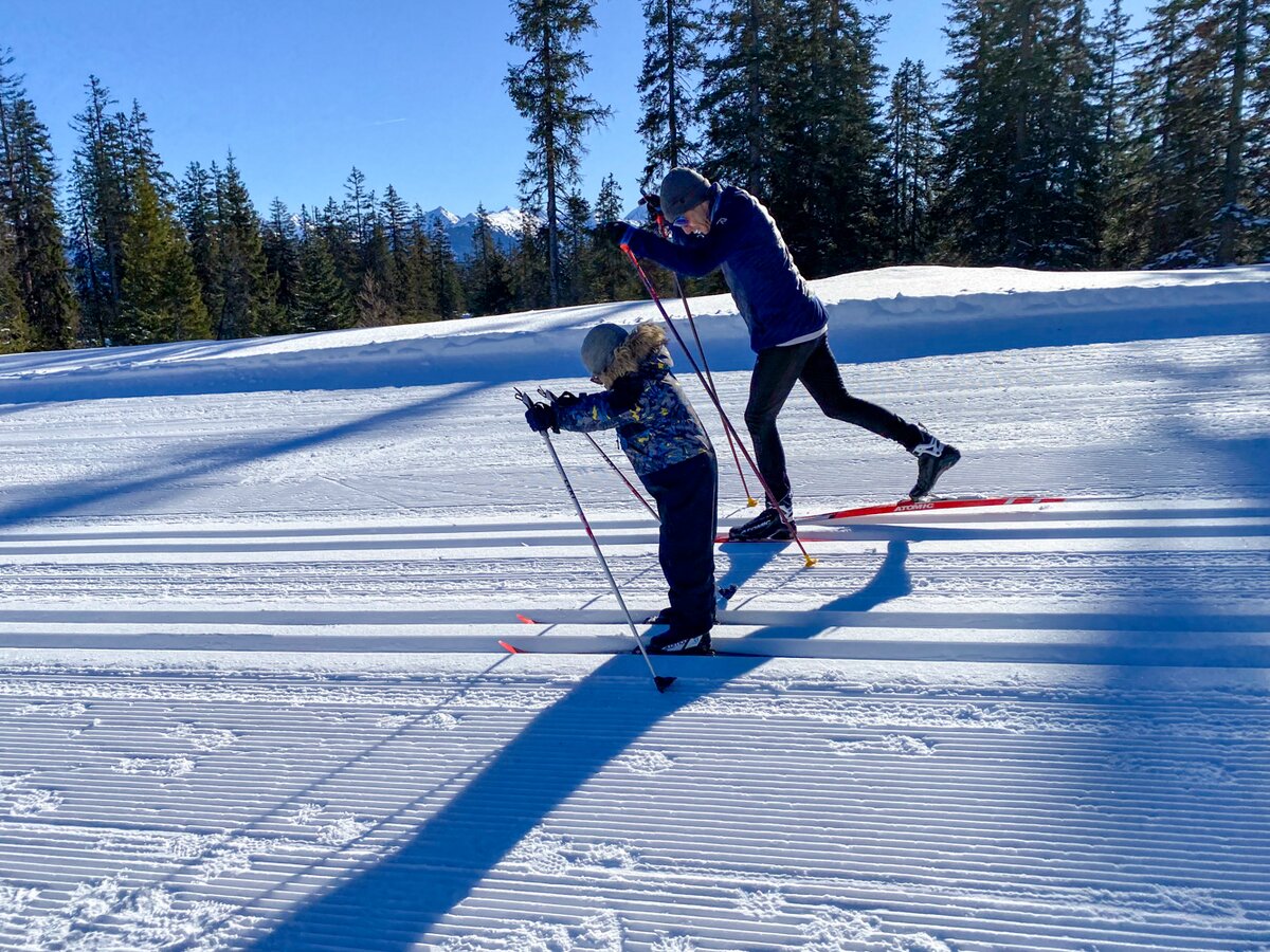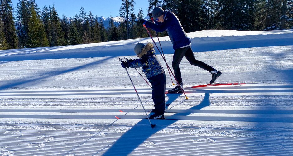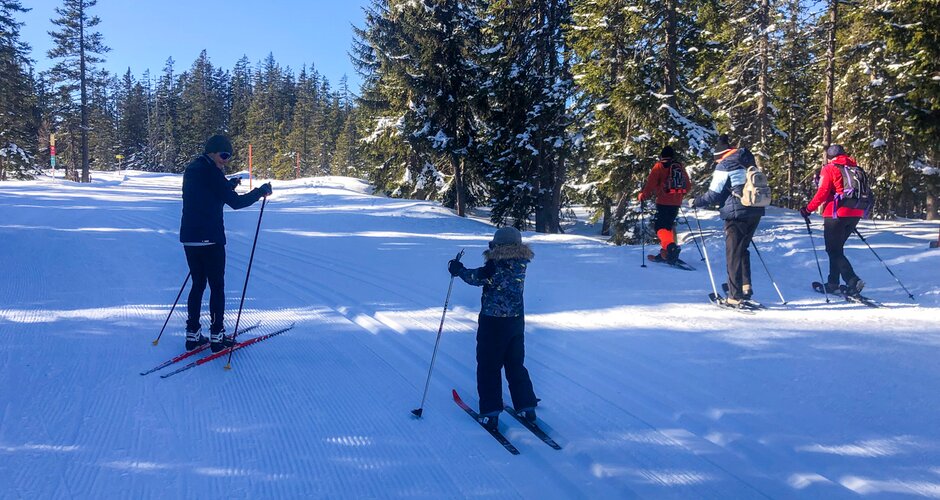 Once at the top, dad and son set off straight onto the cross-country trail: The super-groomed high-altitude trail at 1,600 metres above sea level is quite literally a highlight for both leisurely beginners and advanced cross-country skiers. And we don't even have to mention the view of the magnificent mountain panorama. Both of us were thrilled. And next time we'll bring Grandma and Grandad with us, as winter and snowshoe hikers can also make the round to the Rossbrand right next to the cross-country ski trail.