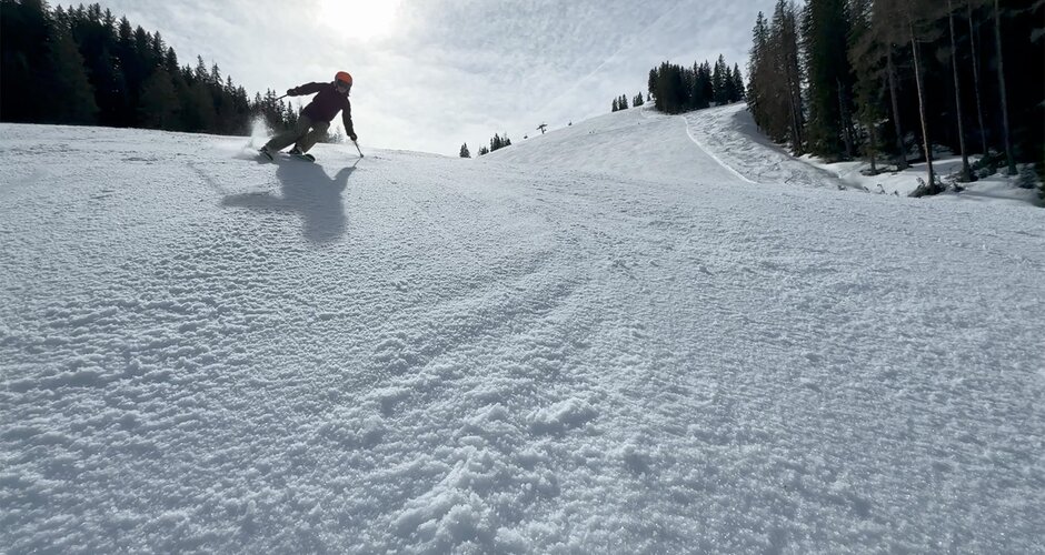 We make our turns down the piste and, out of breath but with a big grin on our faces, head straight to the second piste highlight that Manuela recommends: the ‘Finstergruam’ (Finstergrube). As the name suggests, the piste is rather shady and therefore easy to ski for a long time, even on spring-like days.
