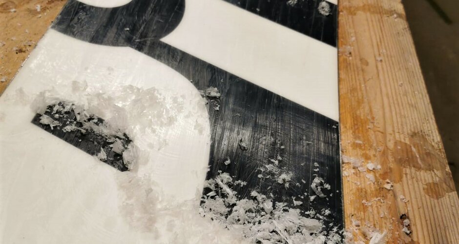 When it is cold enough, take an iron ruler, a spatula or something similar. The next step is to remove the excess wax. Pull the spatula over the wax so that it falls down in white flakes. Be careful not to make any large scratches! You can keep doing this until you can hardly scrape off anymore wax. It's not so bad if a bit of excess wax remains. It just makes your board more slippery and less likely to get stuck. Over time, the wax will wear off.