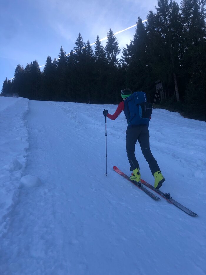 In order for you to be able to go up the mountain at all, the flexible binding is then added (I use the "Zapferl binding" because it is lighter) and the ski touring skins underneath your skis. It is best to buy all of this in a set from your trusted sports retailer. Ski touring boots are lighter and more flexible than alpine ski boots. If you want to save on the purchase, save on the skis or the bindings and rather take a few grams more with you than buying ski touring boots that are cheaper but don't fit perfectly - because that's the most important part of the gear and needs to fit perfectly. Height adjustability is important for the sticks, as is wide plates.