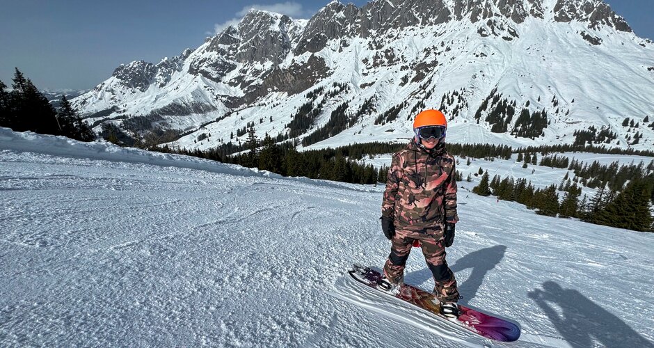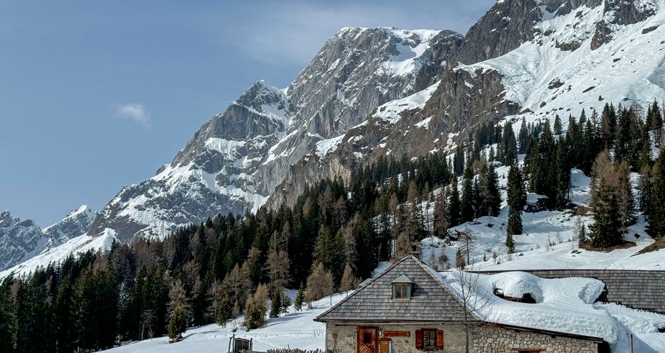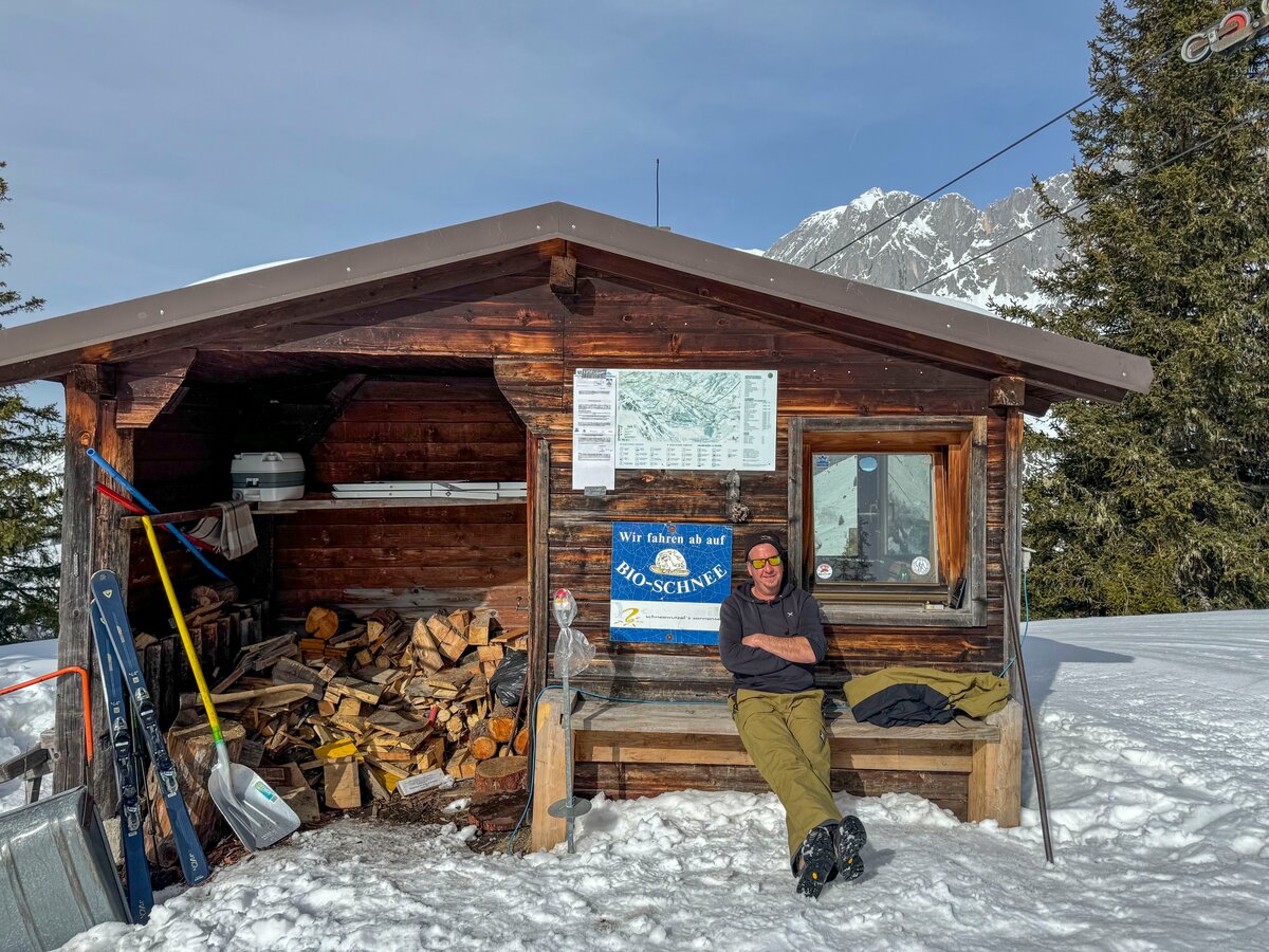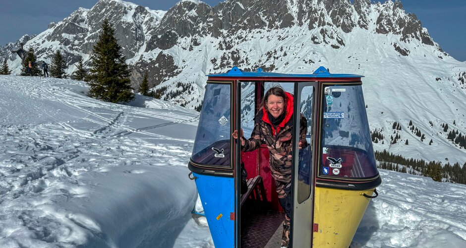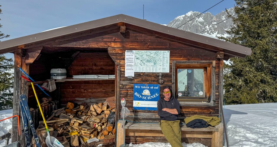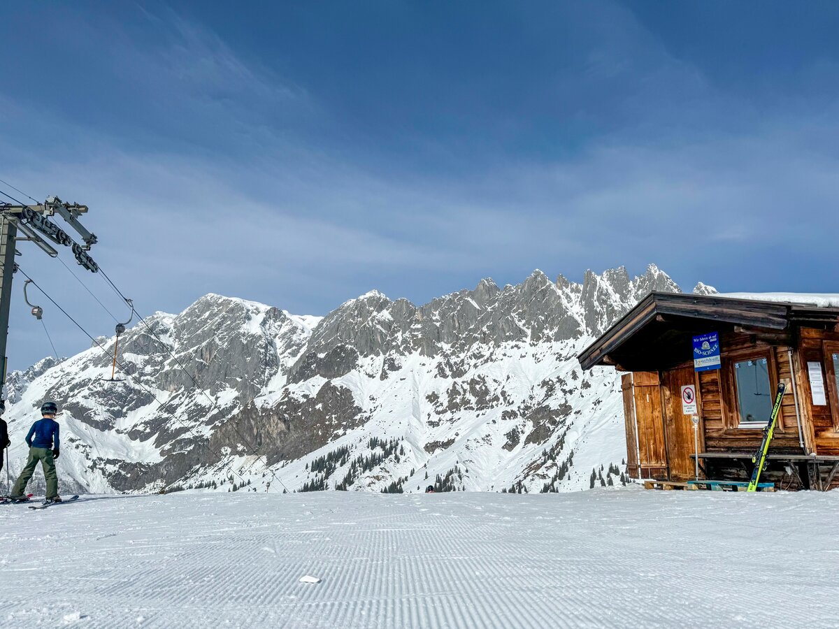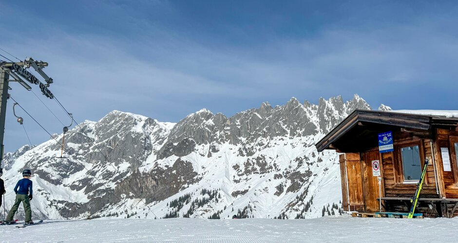 You can feel the personal touch and the passion with which everyone is involved here. When we get off the first lift, the Saukarlift, we strike up a conversation with the lift operator. He is convinced: ‘This is the most beautiful place in the world - next to the Seychelles!’ And he also gives us the brilliant tip of walking a few metres from the Roßwieslift towards the summit cross of the Hochkeil. A magnificent backdrop awaits us there: behind us the Hochkönig massif, in front of us a panoramic view in all directions. Apart from a few friendly ski tourers having a snack, it's absolutely quiet up here.