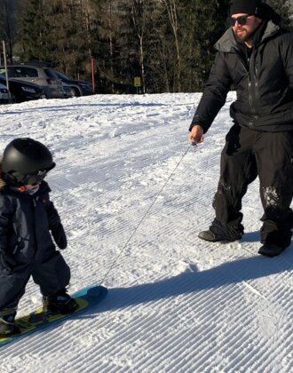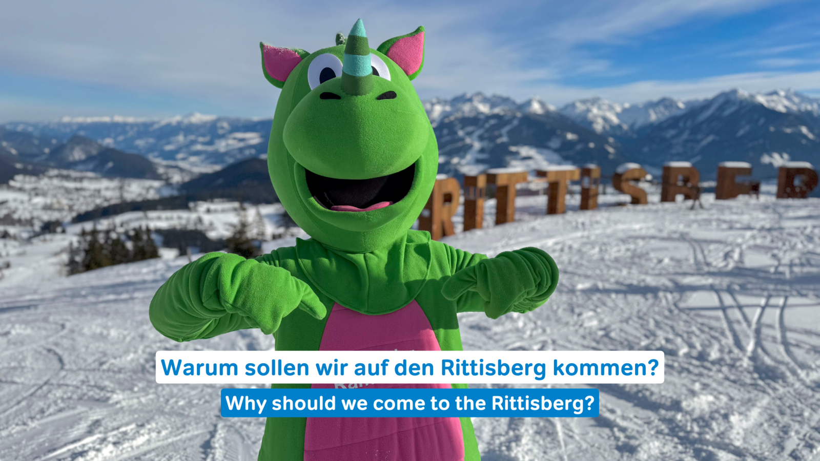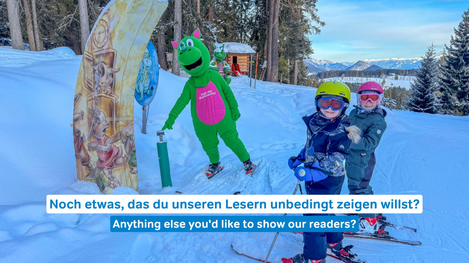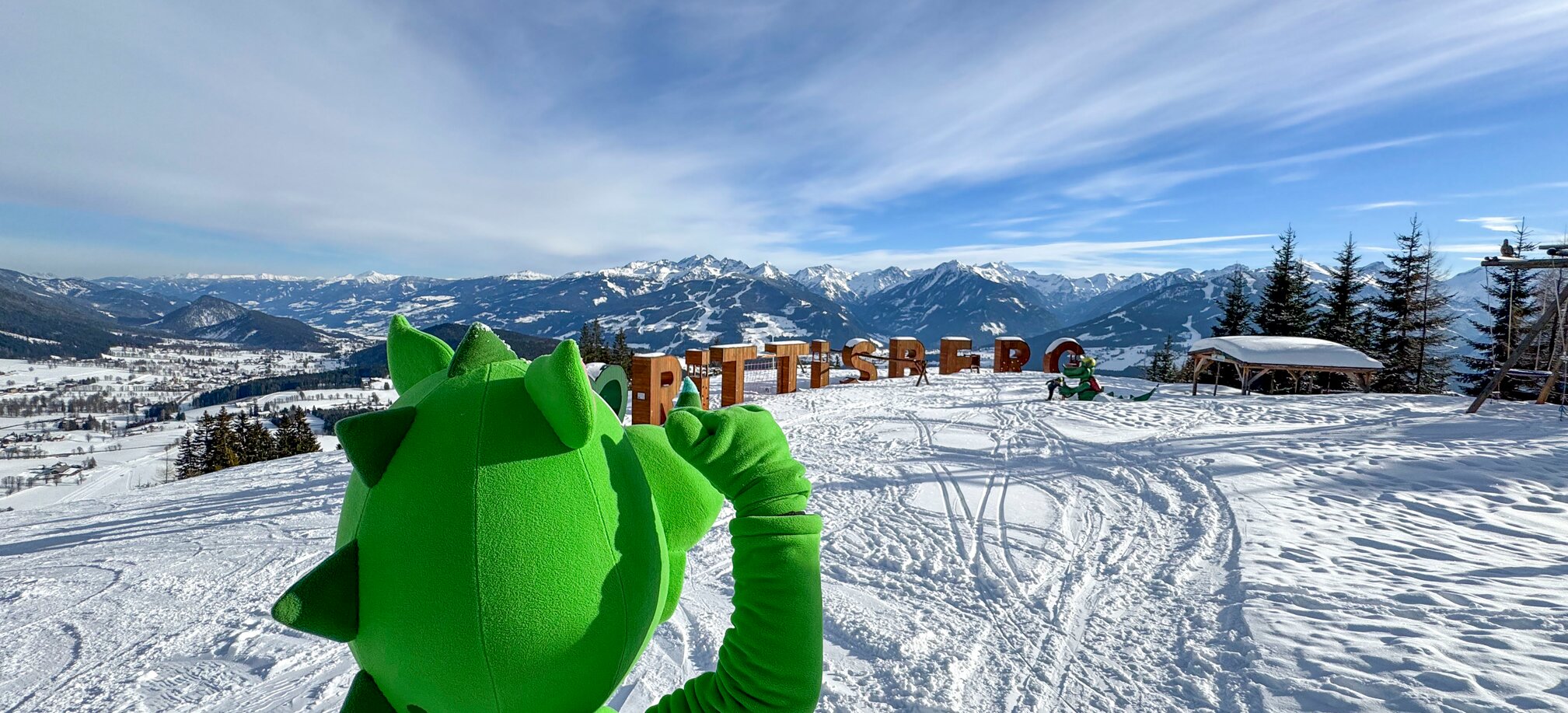 The fluffy, almost 2 metre high plush dinosaur made them smile and when we decided to go for a ride with him, the cheers were huge. With Kali through the fairytale forest over the snow-covered Rittisberg - amazing! But it wasn't just our little ones who were happy about the unexpected visit, the older visitors were too. And so numerous pictures were taken - as always when the celebrities make an appearance...
