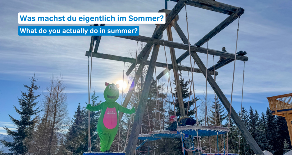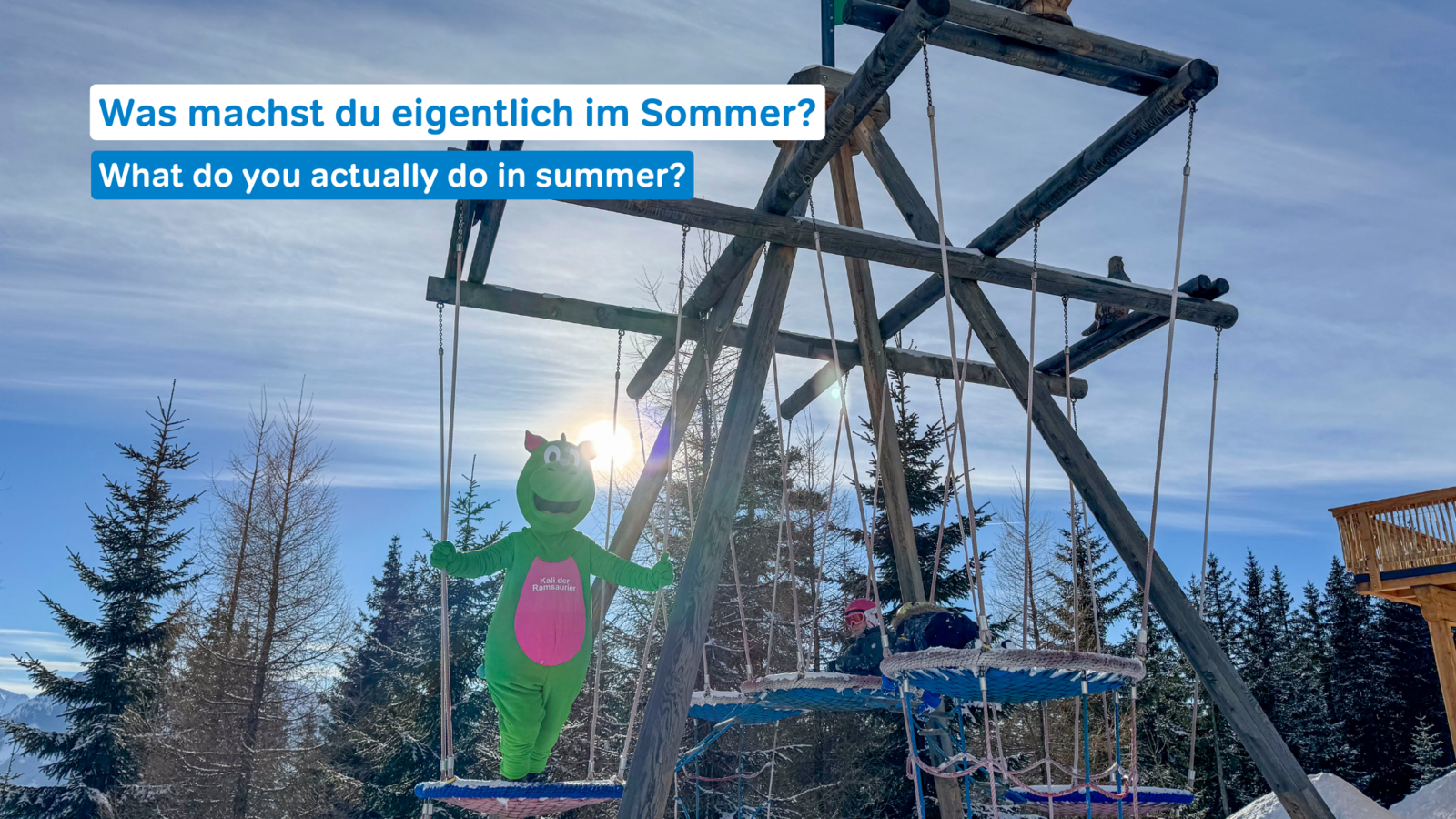 Incidentally, the new Rittisberg cable car, a combination of gondolas and chairs, takes you to the top. Practical for some, because it's warmer in the gondolas. Practical for others who like to keep their skis or snowboard on. At the top, of course, the children immediately discover the playground - which is more for the summer, but seasons have never been an obstacle. Completely out of breath from climbing, they were left breathless. Because who did they discover at the lift exit: KALI, THE RAMSAURUS. For real, so to speak.
